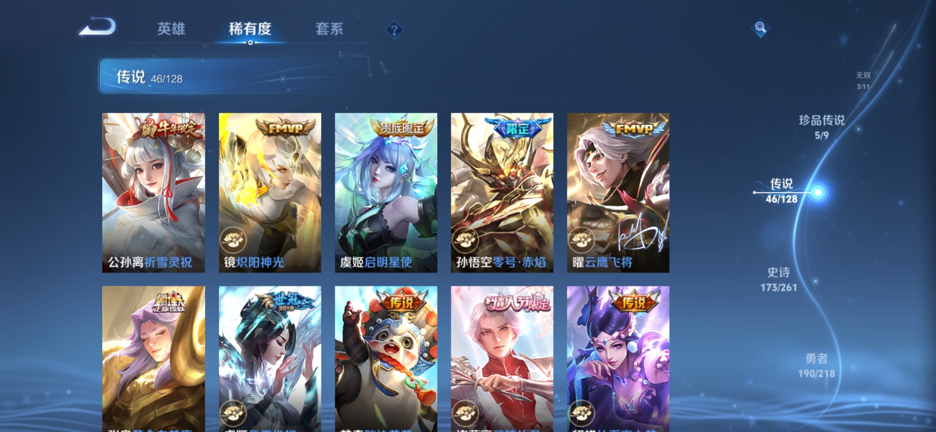 - [12030279]V5 4传说 124英雄 158皮肤 可修改实名 优质装备:久胜战神,地狱火 传说皮:幻光神枪 珍宝阁皮:妄想食味,蔷薇恋人 限定皮:鸣野蒿,至尊宝,遇见飞天,高山流水,五谷丰年,御风骁将(吕布年限),李小龙 史诗皮:化蝶舞,琥珀纪元伽罗,江河有灵,偶像歌手,电玩·爆裂旋风,龙骑士(小龙虾),乱世虎臣,水果甜心,天才门将,星夜王子,心灵骇客,功夫厨神,德古拉伯爵,幽灵船长,鬼剑武藏,纤云弄巧,拒霜思,缤纷独角兽,乘风破浪,逐浪之夏,水晶猎龙者,曙光守护者,箭羽风息,圣诞狂欢,圣诞恋歌,鹰眼统帅,魅力维加斯,黎明之约,未来纪元-赵云
