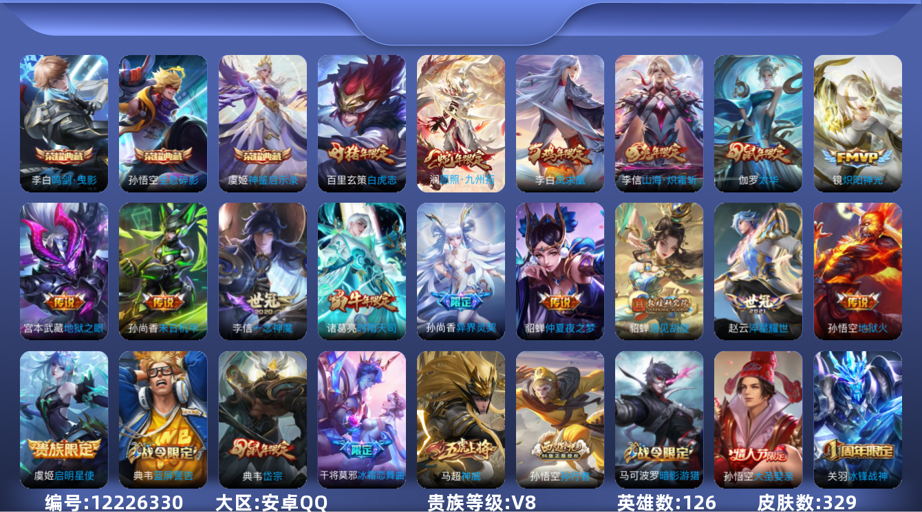 [12226330]V8 3典藏 16传说 126英雄 329皮肤 典藏英雄武则天 可修改实名 女号 优质装备:鸣剑·曳影,全息碎影(猴子典藏),神鉴启示录,炽阳神光,一念神魔,末日机甲-孙尚香(绿蚂蚱),地狱火,仲夏夜之梦(大飞蛾),地狱之眼,淬星耀世,遇见胡旋,山海·炽霜斩(李信年限) 珍宝阁皮:万物之道,优雅恋人,玩趣恶龙 限定皮:愿照·九州拓(澜年限),逐霄战戟,陌上桑,白虎志(电光耗子),凤求凰(白切鸡),太华(伽罗年限),异界灵契(白毛香),白晶晶,时雨天司(水龙头),神威(电光马子),飞衡(韩信年限),遇见飞天,高山流水,五谷丰年,冰锋战神,游园惊梦,梁祝,御风骁将(吕布年限),烈魂,岱宗(典韦年限),天狼征服者,李小龙,逐梦之影,如梦令-后羿,纯白花嫁,孙行者,猪悟能,大圣娶亲,冰霜恋舞曲,美猴王,山海·玄木吟(马可年限) 史诗皮:器灵·浮梦炉,百相守梦-百里守约,紫霞仙子,苍穹之光,电玩小子(小书包),白龙吟,特工魅影,千年之狐,永昼,冰冠公主,偶像歌手,白蛇,晚萤,暗夜猫娘,龙骑士(小龙虾),末日机甲-吕布,猫狗日记-孙策,乱世虎臣,节奏热浪,修罗,女仆咖啡,摇滚巨星,水果甜心,绅士熊喵,天才门将,星夜王子,心灵骇客,时之奇旅-安琪拉,功夫厨神,德古拉伯爵,暗隐猎兽者,幽灵船长,鬼剑武藏,暗渊魔法,心灵战警,舞动绿茵,地狱岩魂,纤云弄巧,繁星吟游(呼啦呼啦),拒霜思,缤纷独角兽,乘风破浪,逐浪之夏,水晶猎龙者,曙光守护者,箭羽风息,金属风暴,原初追逐者,圣诞狂欢,圣诞恋歌,鹰眼统帅,暗夜贵公子,魅力维加斯,黎明之约,无心,未来纪元-赵云