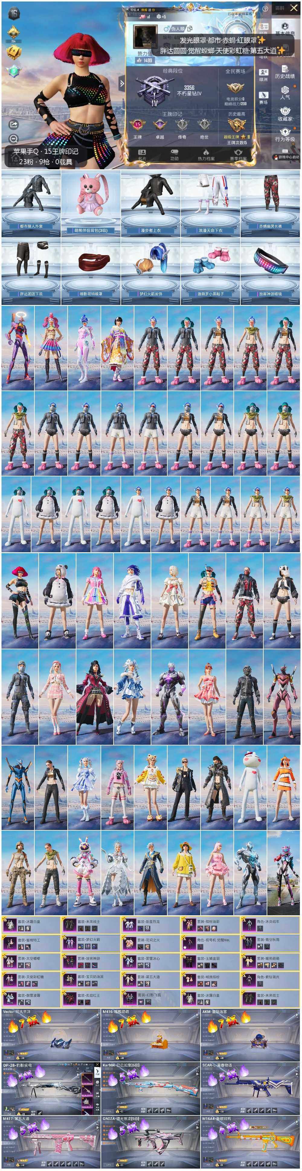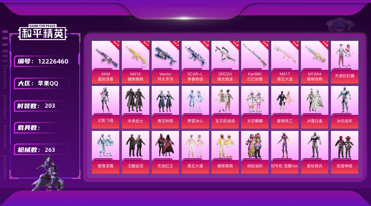 - PX_2061726- 苹果手Q-21王牌印记-12粉装-7特效枪-5载具-101007热力值-220套装-263枪皮-3卓越印记-1传奇印记 【12粉装】,初号机 觉醒Ver.,缤纷油彩,繁龙极客,怪诞乔克,智耀战神,光极星,蓝莓炮弹,深海曼妙,圣堂之誓,绚金战神,幻影战神,齐天大圣 【7特效枪】AKM-炫紫旋律-7级 M416-墨龙九天-3级 M416-心之恋语-7级 Kar98K-巳巳如意-