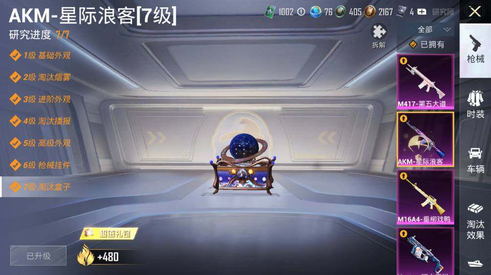 【粉色枪皮等级】:AKM-星际浪客(七级),M16A4-垂柳戏鸭(四级),SCAR-L-青春物语(五级),M416-暖熊萌萌(七级),GROZA-镜光银凌(五级),Vector-环太平洋(七级),Kar98K-巳巳如意(五级),M417-第五大道(五级),DP-28-豹影疾电(五级)