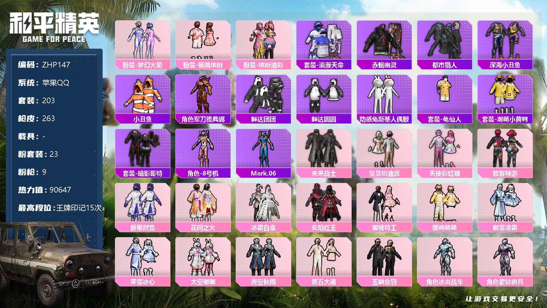 [12226460]【商品标题】:热门粉装!觉醒螳螂!放客神游!苹果 手Q-23粉装-9特效枪-0载具-6粉色飞行器-90647热力值-15王牌印记-203套装-263枪皮