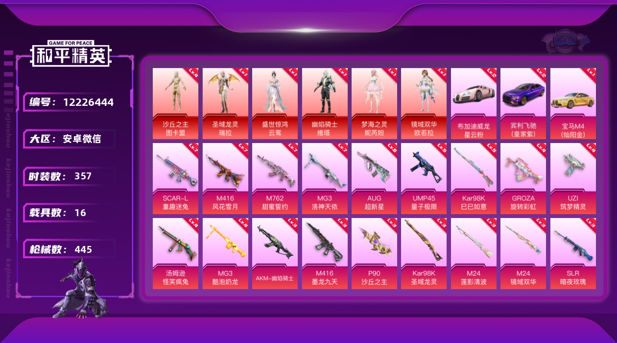 - PX_2063159- 苹果手Q-8王牌印记-2粉装-6特效枪-1载具-64712热力值-157套装-214枪皮-1卓越印记-0传奇印记 【2粉装】,恐龙拽拽,暗夜玫瑰 【6特效枪】AKM-绿萝繁花-4级 SCAR-L-锦绣绵绵-4级 M416-风花雪月-1级 M416-五爪金龙-6级 AUG-星之彼岸-5级 Kar98K-巳巳如意-3级 【6稀有紫装】,奇异狩猎者,浪漫天命,雪山精英,浪漫波比