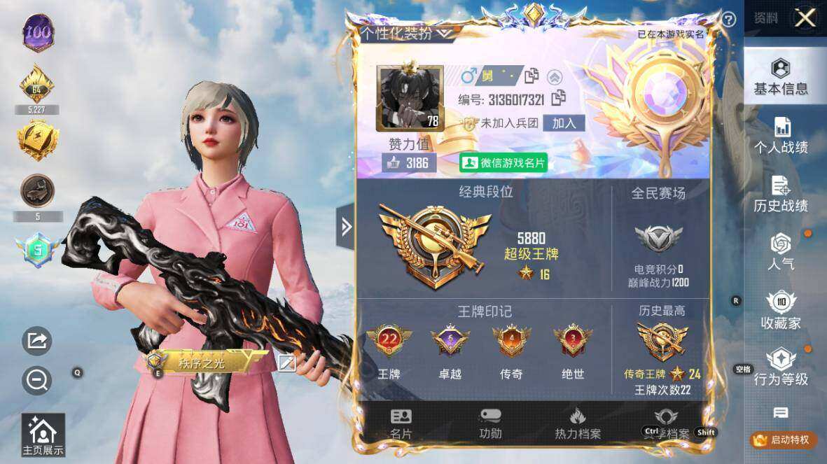 - [11817920]1粉装 2特效枪 2印记 可二次 可修改实名 女号 安全保护中 优质装备:SCAR-L-锦绣绵绵 热门装扮:蜜语绒猫,恶魔喵喵,呆萌铁蟹 稀有枪皮:DP-28-豹影疾电 五级特效枪:五级SCAR-L-锦绣绵绵 一级特效枪:一级DP-28-豹影疾电 紫色装扮:飞狐塔尔斯,SS23特训,摩登艾咪,野性战心,缤纷果语,耀眼新星,魅力单车,龟仙人,柠萌假日,幻影武者,白熊同盟,空岛之星,王牌教练,SS28特训,神气赞萌露比,冰公主,都市丽猫,粉红小猪,焰鹰斗篷,幻羽潜行,幽夜迷踪,SS27特训,萌趣绒叽,SS32特训服(SS32特训套装),白糯汤圆 优质战备:精灵梦叶罗丽降落伞,江南烟雨降落伞,第五大道降落伞,飞行器-天之羽翼