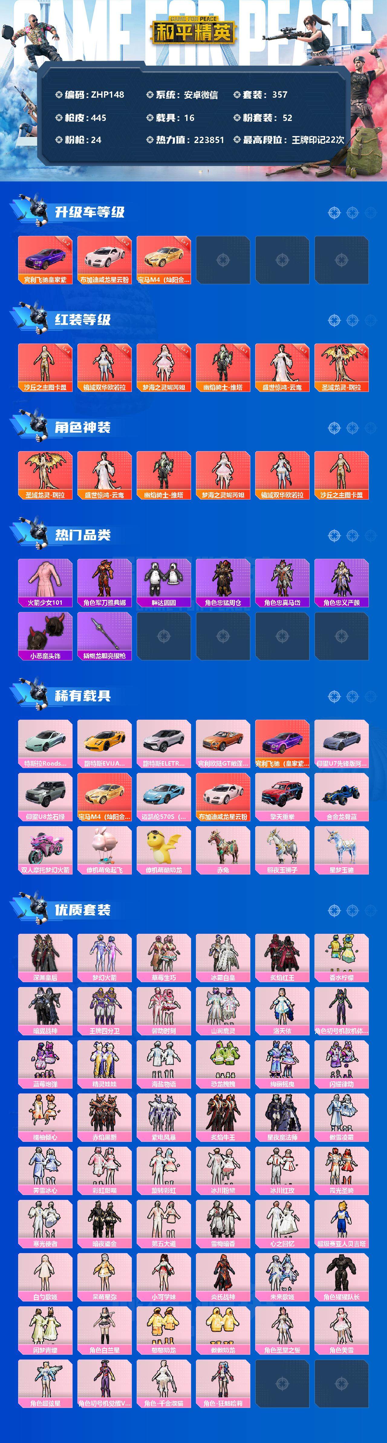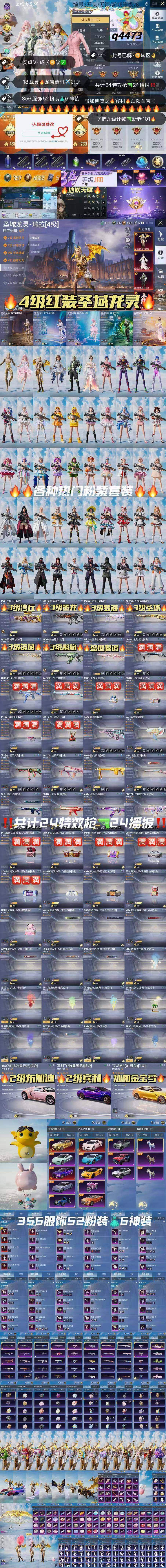 [12226444]【商品标题】:老101!4级图卡盟!1级瑞拉妮芮妲欧若拉维塔!安卓 微信-6神装-52粉装-24特效枪-16载具-25粉色飞行器-223851热力值-22王牌印记-357套装-445枪皮 【红色载具】:宾利飞驰(皇家紫)(二级),布加迪威龙(星云粉)(二级),宝马M4(灿阳金)(一级) 【红色神装等级】:圣域龙灵-瑞拉(一级),盛世惊鸿-云鸾(一级),幽焰骑士-维塔(一级),梦海之灵-妮芮妲(一级),镜域双华-欧若拉(一级),沙丘之主-图卡盟(四级) 【红色角色神装】:圣域龙灵-瑞拉,盛世惊鸿-云鸾,幽焰骑士-维塔,梦海之灵-妮芮妲,镜域双华-欧若拉,沙丘之主-图卡盟 【热门品类】:粉装-梦幻火箭,套装-火箭少女101,套装-奇异狩猎者,角色-军刀雅典娜,套装-胖达圆圆,角色-忠猛周仓,角色-忠真马岱,角色-忠义严颜,套装-龟仙人,套装-暗影哥特,角色-8号机,角色-Mark.06,小恶魔头饰,大砍刀-青龙偃月刀,撬棍-龙胆亮银枪 【粉色载具】:特斯拉Roadster(水滴蓝),路特斯EVIJA(星际黄),路特斯ELETRE(花绽灰),宾利欧陆GT敞篷(火焰橘),宾利飞驰(皇家紫),仰望U7(阿盖尔紫),仰望U8(龙石绿),宝马M4(灿阳金),迈凯伦570S(天际蓝),布加迪威龙(星云粉),擎天重拳,合金龙骨(蓝),双人摩托-梦幻火箭,僚机-萌兔起飞,僚机-萌酷奶龙,赤兔,照夜玉狮子,星梦玉骢 【粉色套装】:粉装-深渊皇后,粉装-梦幻火箭,粉装-草莓生巧,粉装-冰霜白皇,粉装-炙焰红王,粉装-香水柠檬,粉装-暗翼战神,粉装-王牌四分卫,粉装-馨动时刻,粉装-山涧鹿灵,角色-洛天依,角色-初号机款机体服,粉装-蓝莓炮弹,粉装-精灵娃娃,粉装-海盐物语,粉装-恐龙拽拽,粉装-绚丽摇曳,粉装-闪耀律动,粉装-橘柚倾心,粉装-赤焰黑爵,粉装-紫电风暴,粉装-炙焰牛王,粉装-星夜魔法师,粉装-傲雪凌霜,粉装-霁雪冰心,粉装-彩虹甜喵,粉装-旋转彩虹,粉装-冰川粉黛,粉装-冰川红玫,粉装-霞光圣骑,粉装-寒光使者,粉装-暗夜鎏金,粉装-第五大道,粉装-雪梅暗香,粉装-心之回忆,超级赛亚人-贝吉塔,角色-白勺歌姬,角色-呆萌星弥,角色-小可学妹,粉装-炎氏战神,粉装-未来歌姬,角色-猩猩队长,粉装-闲梦青缨,角色-白兰星,粉装-憨憨奶龙,粉装-傲傲奶龙,角色-圣堂之誓,角色-美