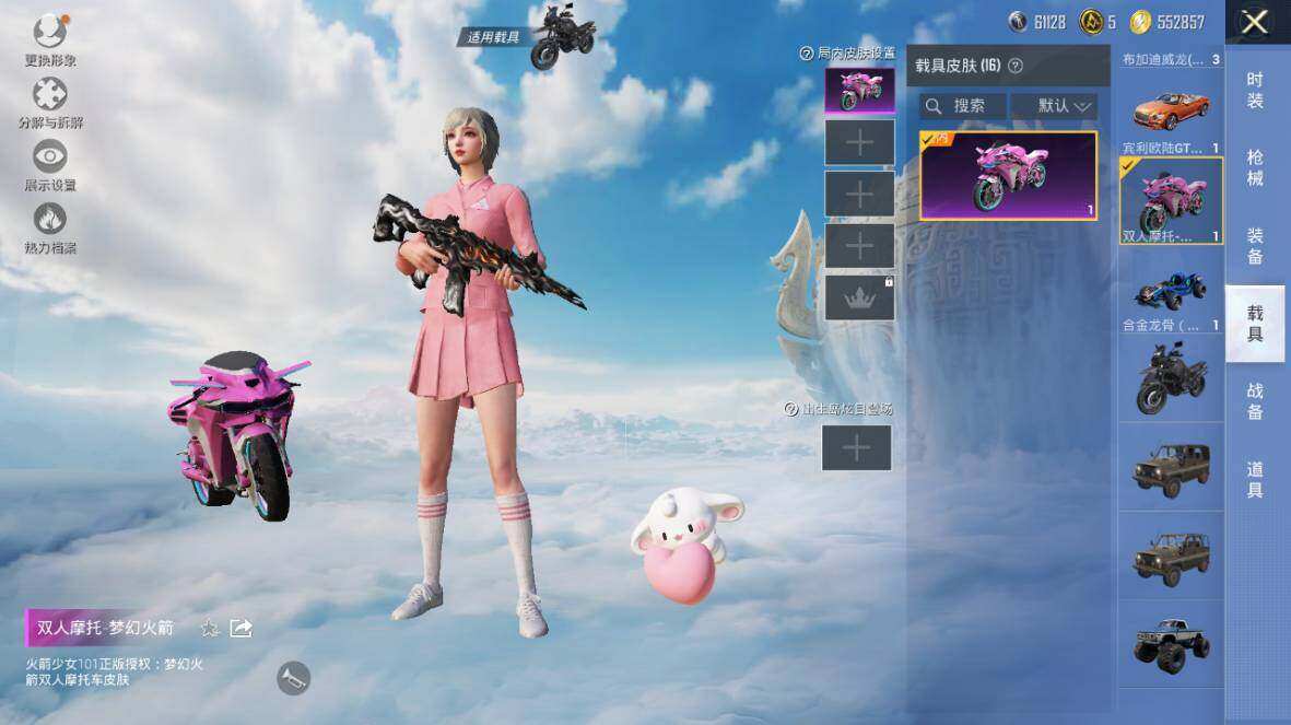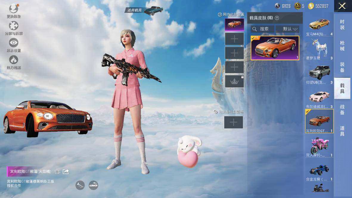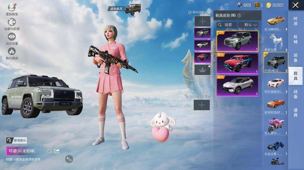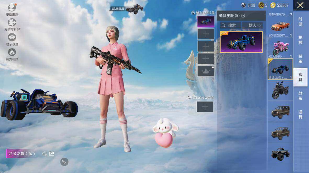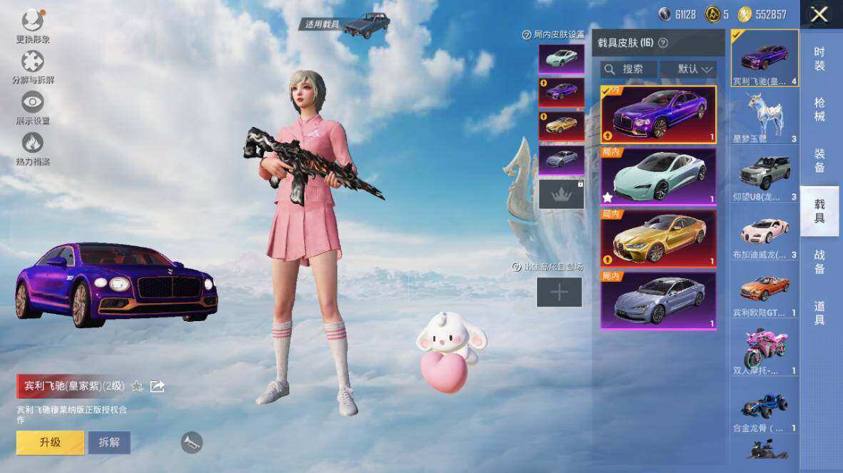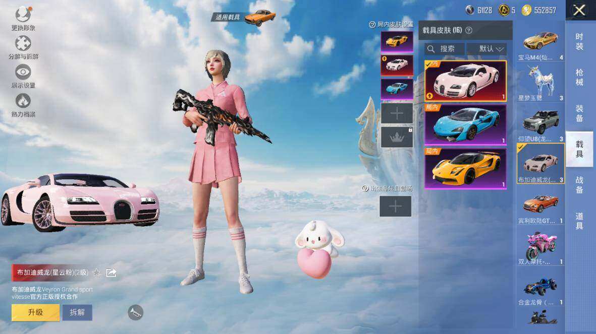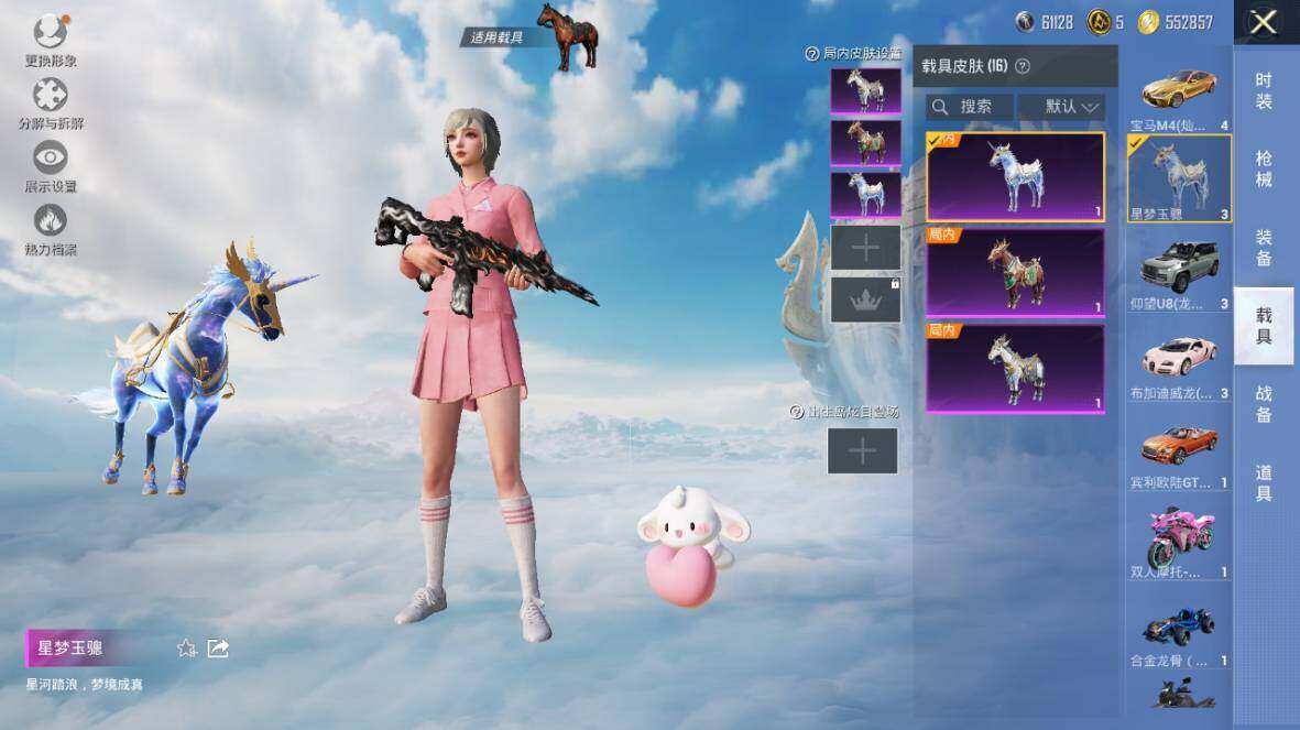 【粉色载具】:特斯拉Roadster(水滴蓝),路特斯EVIJA(星际黄),路特斯ELETRE(花绽灰),宾利欧陆GT敞篷(火焰橘),宾利飞驰(皇家紫),仰望U7(阿盖尔紫),仰望U8(龙石绿),宝马M4(灿阳金),迈凯伦570S(天际蓝),布加迪威龙(星云粉),擎天重拳,合金龙骨(蓝),双人摩托-梦幻火箭,僚机-萌兔起飞,僚机-萌酷奶龙,赤兔,照夜玉狮子,星梦玉骢