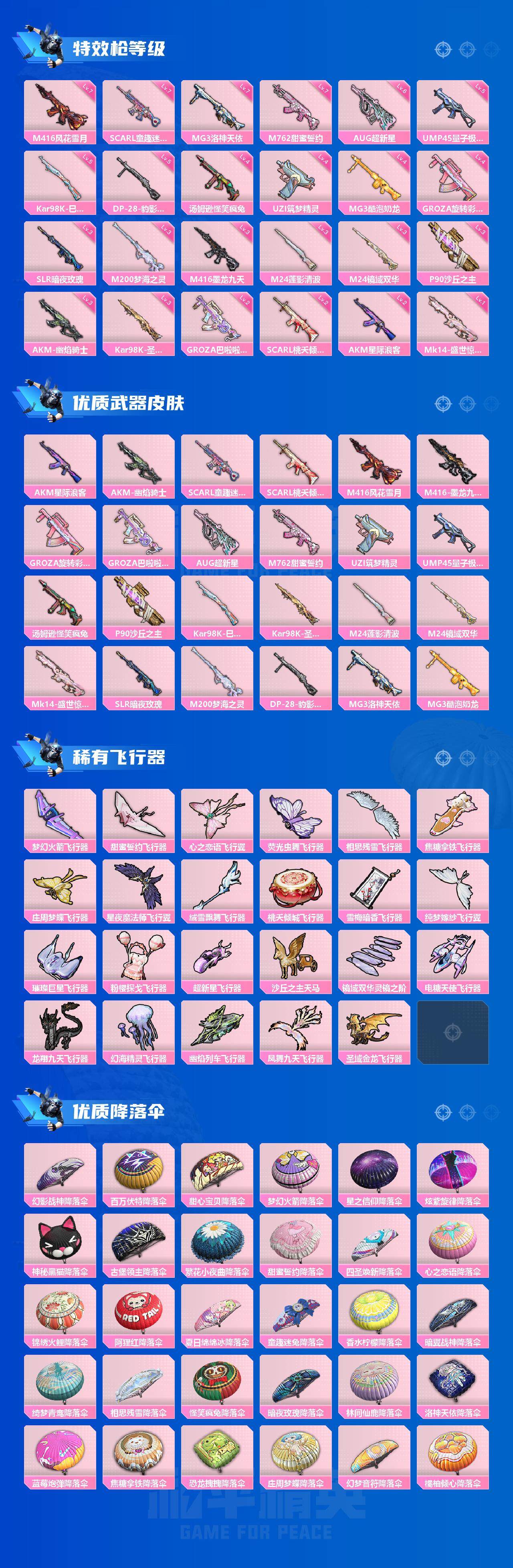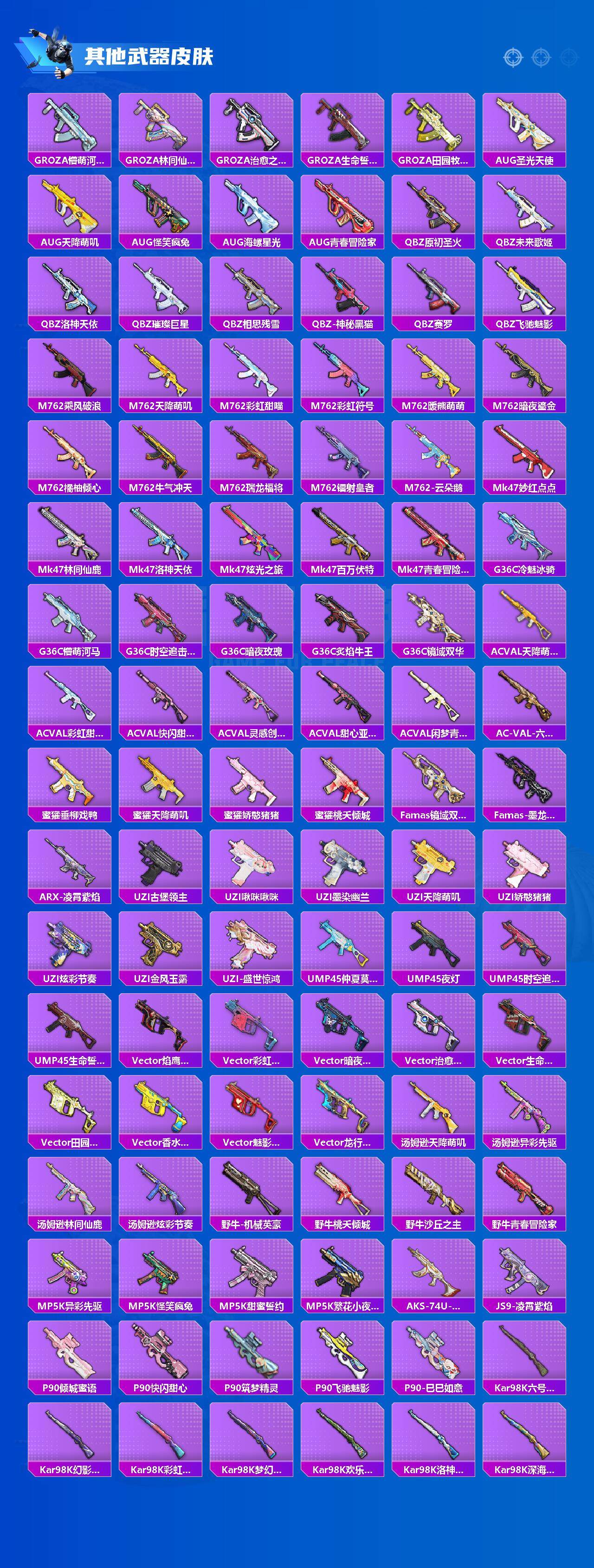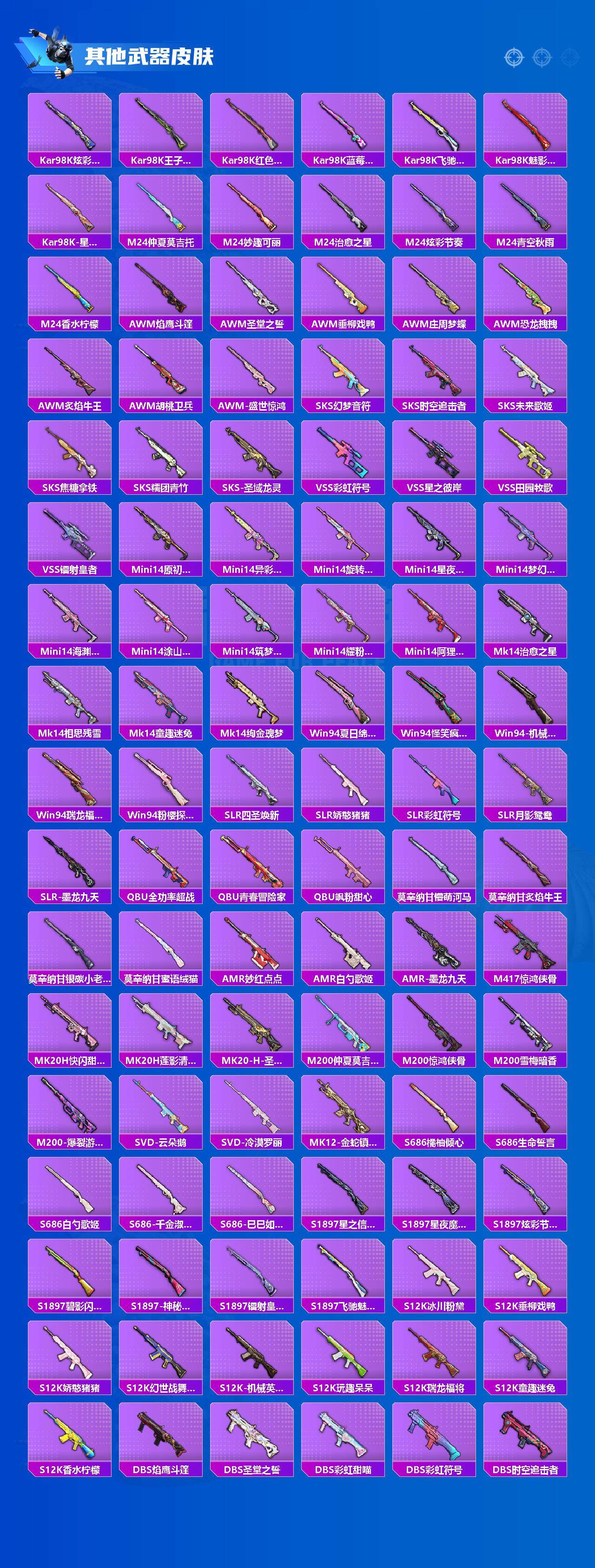 AKM-星际浪客,AKM-幽焰骑士,SCAR-L-童趣迷兔,SCAR-L-桃夭倾城,M416-风花雪月,M416-墨龙九天,GROZA-旋转彩虹,GROZA-巴啦啦小魔仙,AUG-超新星,M762-甜蜜誓约,UZI-筑梦精灵,UMP45-量子极限,汤姆逊-怪笑疯兔,P90-沙丘之主,Kar98K-巳巳如意,Kar98K-圣域龙灵,M24-莲影清波,M24-镜域双华,Mk14-盛世惊鸿,SLR-暗夜玫瑰,M200-梦海之灵,MG3-洛神天依,MG3-酷泡奶龙