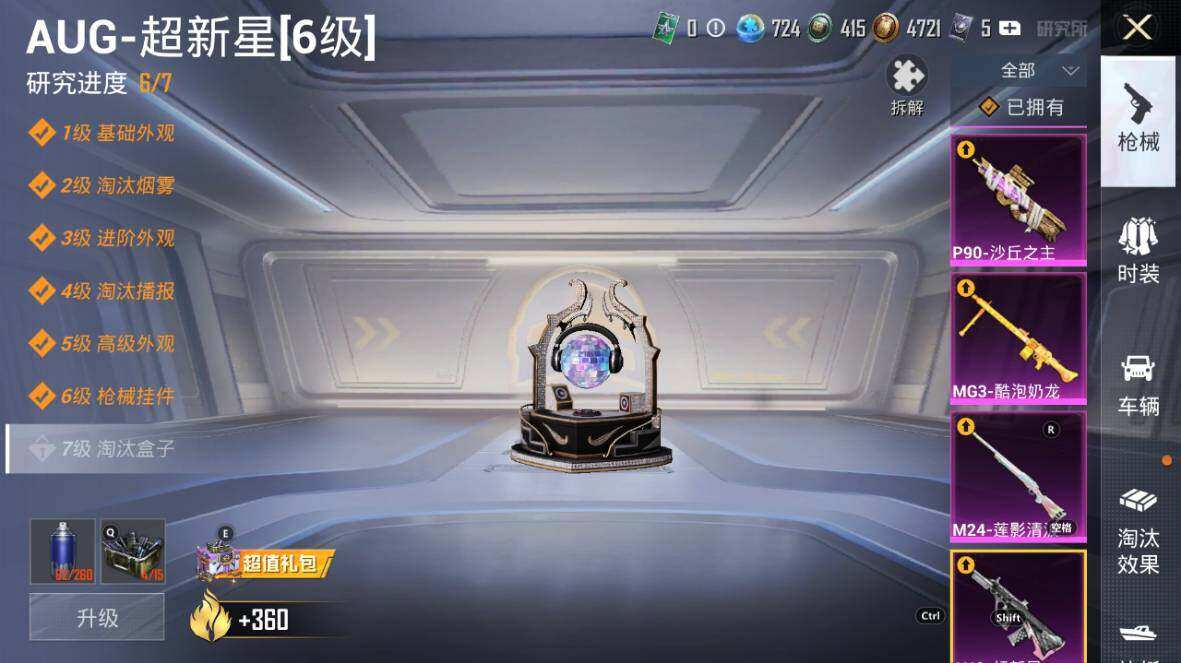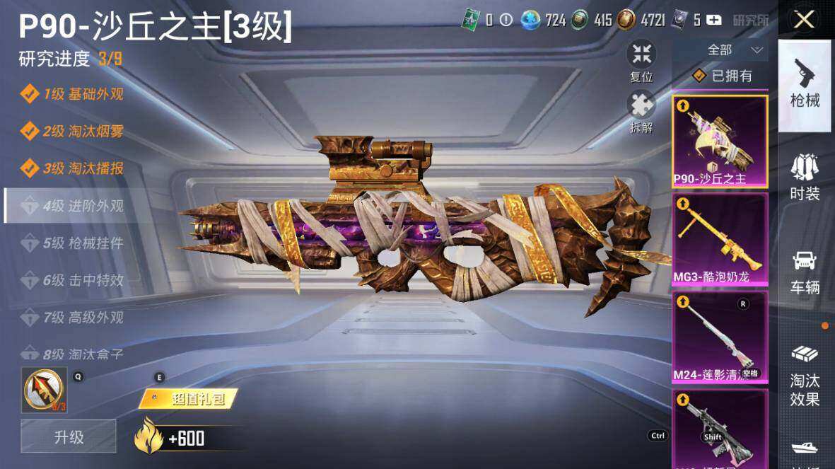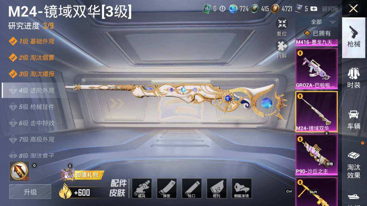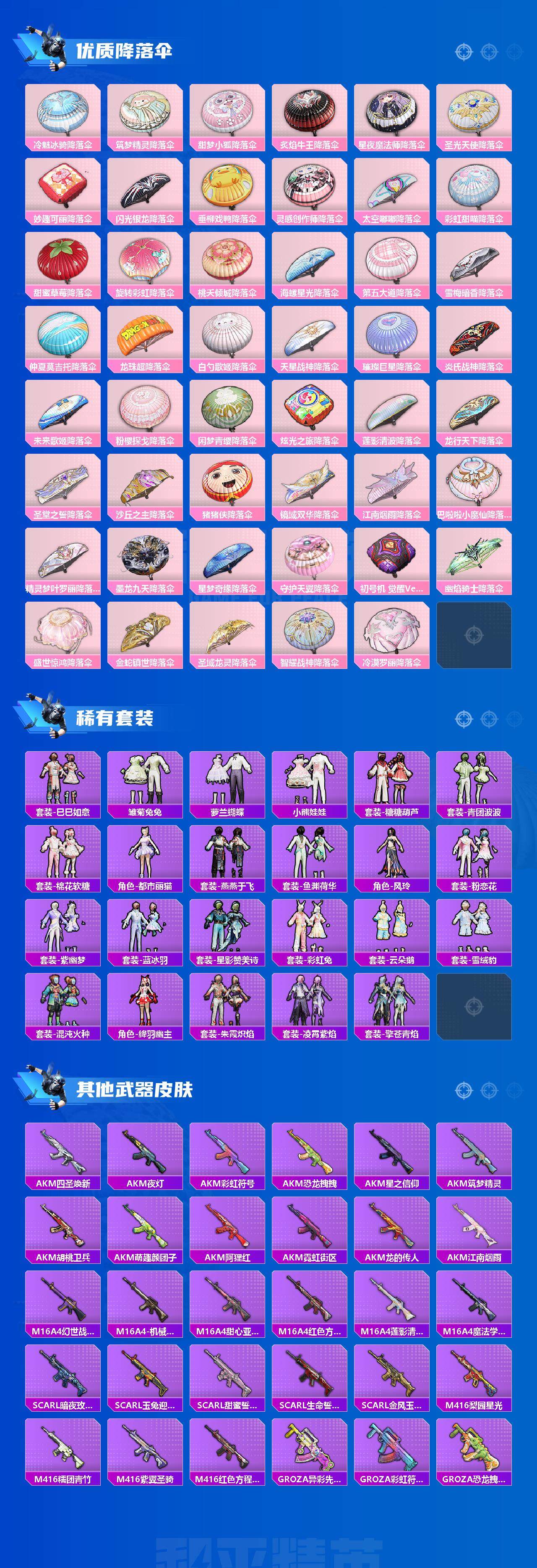 AKM-星际浪客,AKM-幽焰骑士,SCAR-L-童趣迷兔,SCAR-L-桃夭倾城,M416-风花雪月,M416-墨龙九天,GROZA-旋转彩虹,GROZA-巴啦啦小魔仙,AUG-超新星,M762-甜蜜誓约,UZI-筑梦精灵,UMP45-量子极限,汤姆逊-怪笑疯兔,P90-沙丘之主,Kar98K-巳巳如意,Kar98K-圣域龙灵,M24-莲影清波,M24-镜域双华,Mk14-盛世惊鸿,SLR-暗夜玫瑰,M200-梦海之灵,MG3-洛神天依,MG3-酷泡奶龙