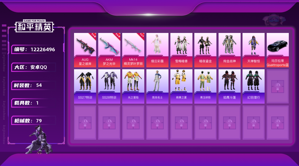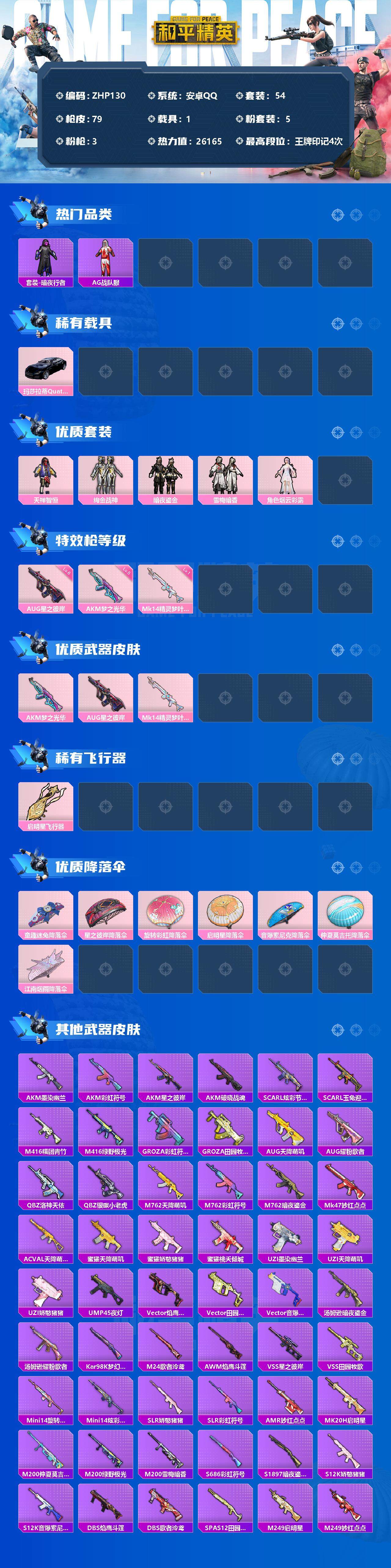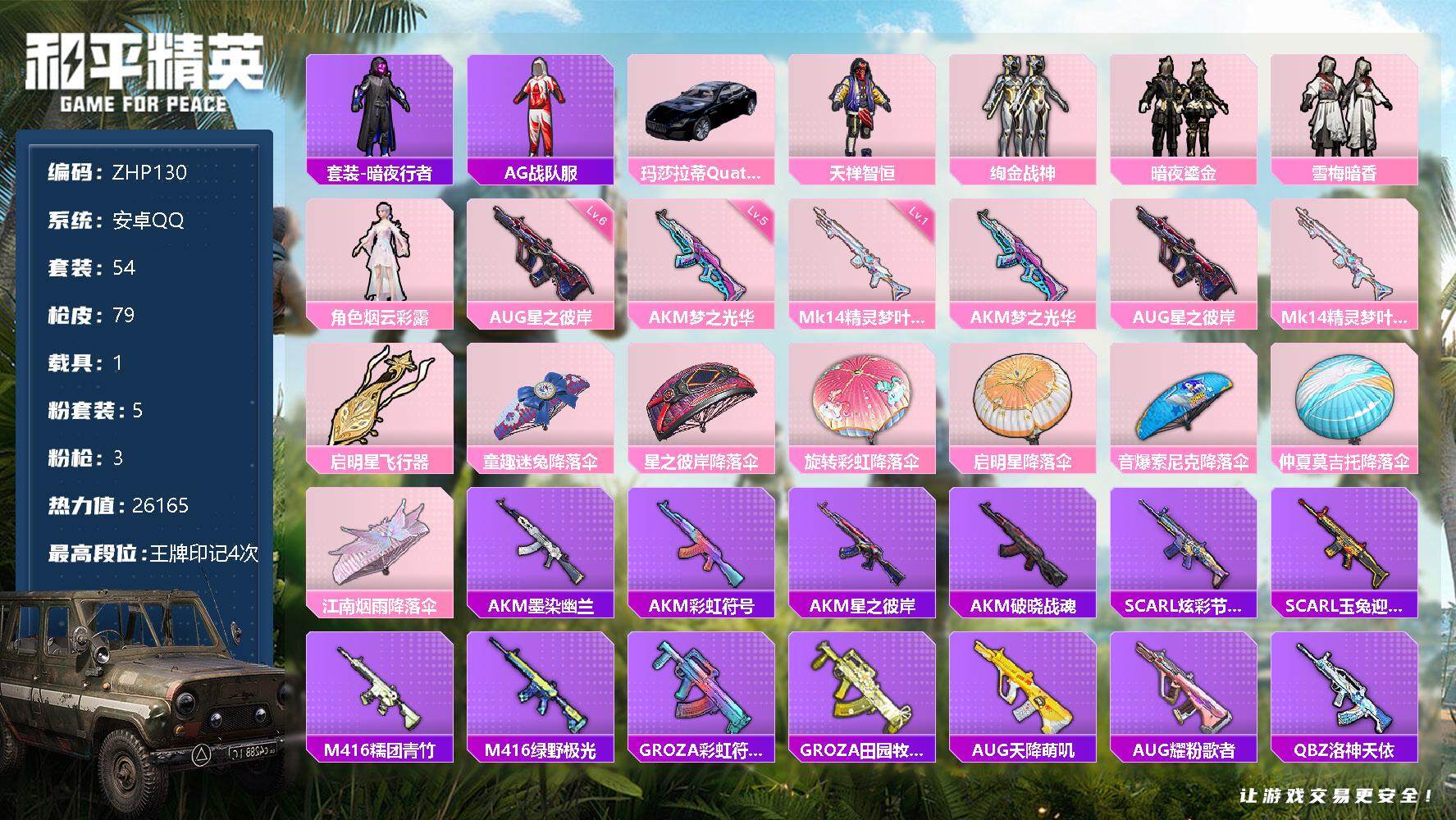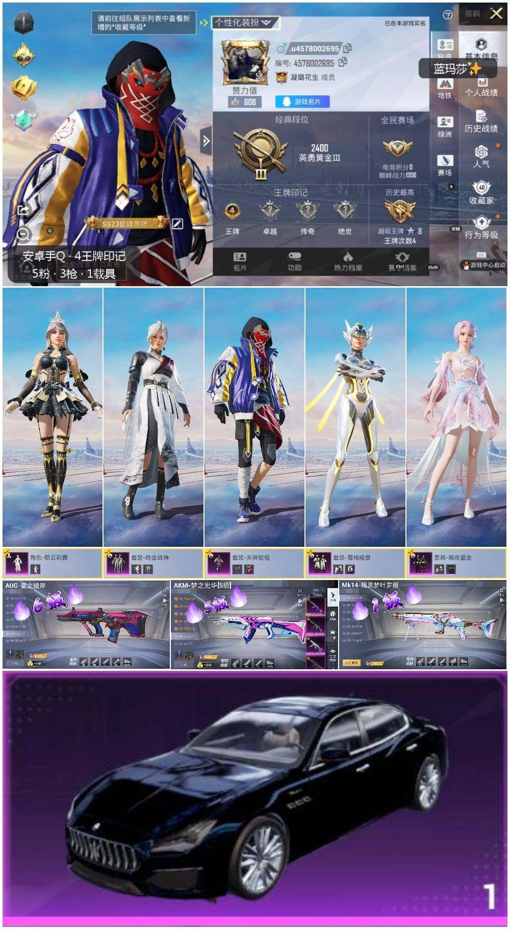[12226496]【商品标题】:安卓 手Q-5粉装-3特效枪-1载具-1粉色飞行器-26165热力值-4王牌印记-54套装-79枪皮 【热门品类】:套装-暗夜行者,套装-AG战队服 【粉色载具】:玛莎拉蒂Quattroporte(夜幕蓝) 【粉色套装】:粉装-天禅智恒,粉装-绚金战神,粉装-暗夜鎏金,粉装-雪梅暗香,角色-烟云彩露 【粉色枪皮等级】:AKM-梦之光华(五级),AUG-星之彼岸(六级),Mk14-精灵梦叶罗丽(一级) 【粉色枪皮】:AKM-梦之光华,AUG-星之彼岸,Mk14-精灵梦叶罗丽 【粉色飞行器】:启明星飞行器 【粉色降落伞】:童趣迷兔降落伞,星之彼岸降落伞,旋转彩虹降落伞,启明星降落伞,音爆索尼克降落伞,仲夏莫吉托降落伞,江南烟雨降落伞 【稀有枪皮】:AKM-墨染幽兰,AKM-彩虹符号,AKM-星之彼岸,AKM-破晓战魂,SCAR-L-炫彩节奏,SCAR-L-玉兔迎春,M416-糯团青竹,M416-绿野极光,GROZA-彩虹符号,GROZA-田园牧歌,AUG-天降萌叽,AUG-耀粉歌者,QBZ-洛神天依,QBZ-银碳小老虎,M762-天降萌叽,M762-彩虹符号,M762-暗夜鎏金,Mk47-妙红点点,AC-VAL-天降萌叽,蜜獾-天降萌叽,蜜獾-娇憨猪猪,蜜獾-桃夭倾城,UZI-墨染幽兰,UZI-天降萌叽,UZI-娇憨猪猪,UMP45-夜灯,Vector-焰鹰斗篷,Vector-田园牧歌,Vector-音爆索尼克,汤姆逊-暗夜鎏金,汤姆逊-耀粉歌者,Kar98K-梦幻火箭,M24-歌者泠鸢,AWM-焰鹰斗篷,VSS-星之彼岸,VSS-田园牧歌,Mini14-旋转彩虹,Mini14-炫彩节奏,SLR-娇憨猪猪,SLR-彩虹符号,AMR-妙红点点,MK20-H-启明星,M200-仲夏莫吉托,M200-绿野极光,M200-雪梅暗香,S686-彩虹符号,S1897-暗夜鎏金,S12K-音爆索尼克,S12K-娇憨猪猪,DBS-焰鹰斗篷,DBS-歌者泠鸢,SPAS-12-田园牧歌,M249-启明星,M249-妙红点点,M249-星之彼岸,M249-糯团青竹,DP-28-焰鹰斗篷,DP-28-旋转彩虹,MG3-妙红点点,MG3-暗夜行者,沙漠之鹰-旋转彩虹,大砍刀-雪梅暗香 【其他套装】:套装-SS21特训,套装-SS22特训,套装-SS23特训,套装-SS27特训,套