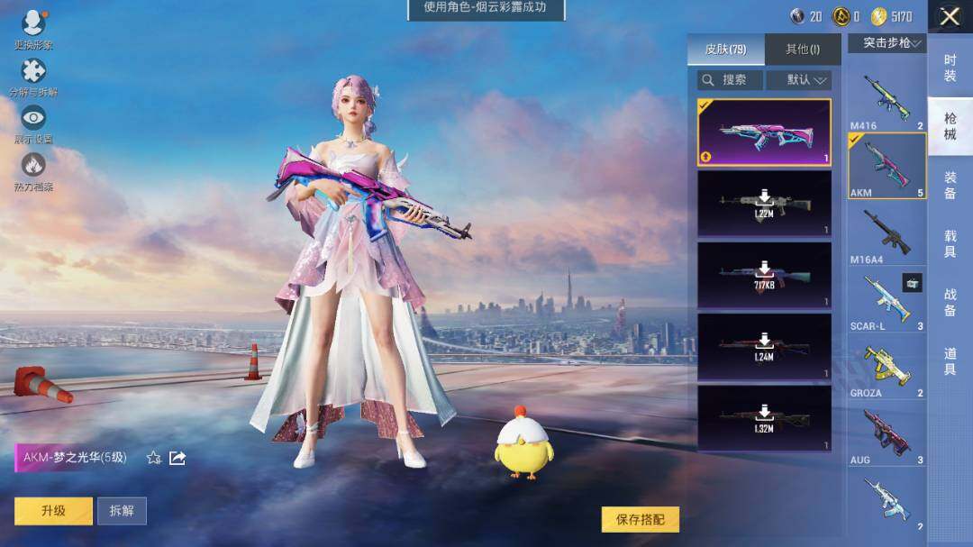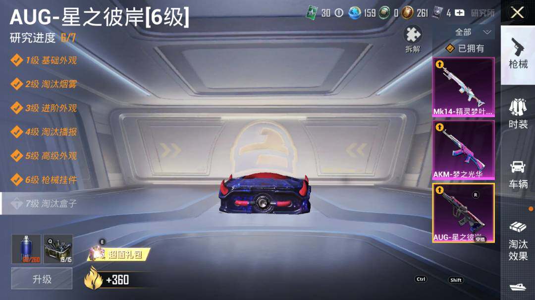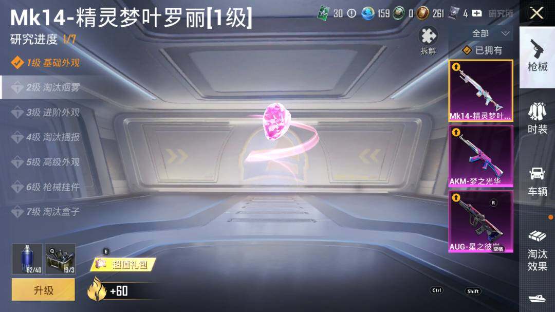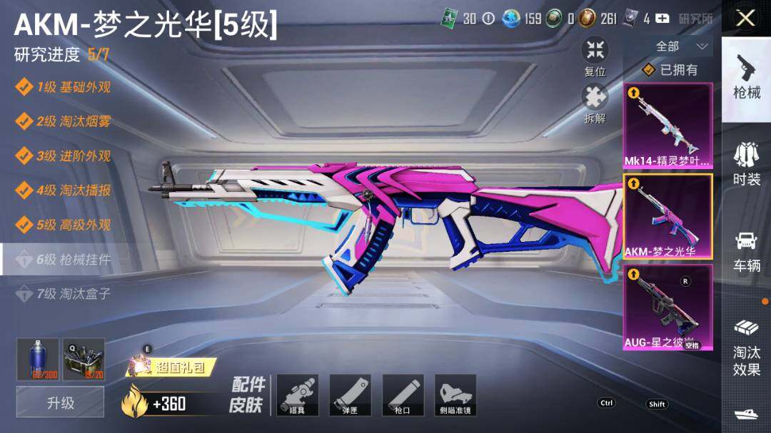 【粉色枪皮等级】:AKM-梦之光华(五级),AUG-星之彼岸(六级),Mk14-精灵梦叶罗丽(一级)