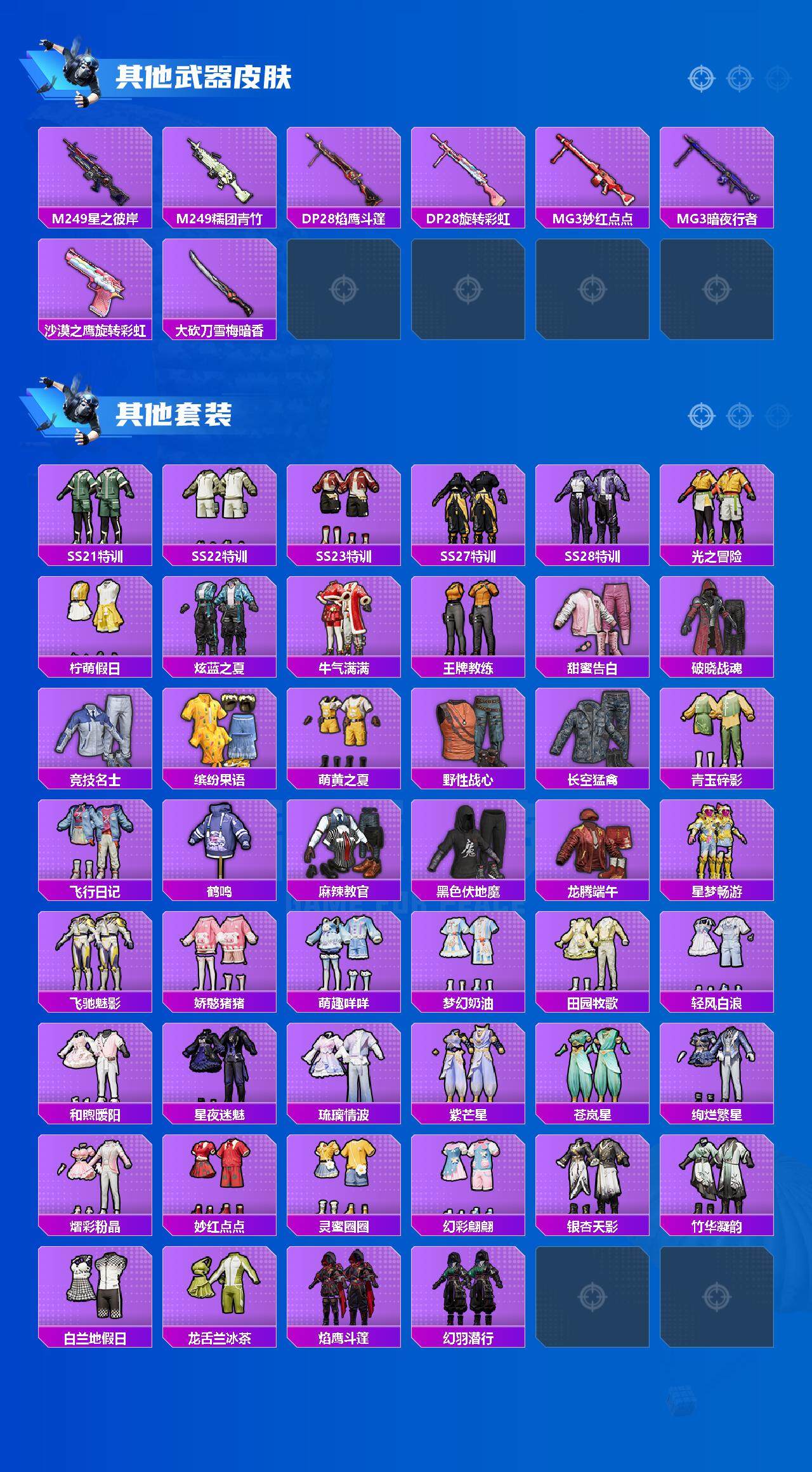 - [11571775]7粉装 10特效枪 2印记 可二次 可修改实名 身法装备:初号机 觉醒Ver.(新紫螳螂),8号机(新粉螳螂),Mark.06(新蓝螳螂) 优质装备:梦幻火箭(新101)(新火箭少女101粉色套装),AKM绿萝繁花,M416电玩时刻,Kar98K创世·救赎,UMP45量子极限,P90-金丰海韵,M762-青锋波束,GROZA-镜光银凌,AUG-暖羊咩咩,罗征,Kar98K-巳巳如意 热门装扮:星夜魔法师,创世·救赎,守护天翼,初号机 觉醒Ver.(新紫螳螂),金丰海韵 稀有枪皮:DP-28-豹影疾电 五级特效枪:五级M762-青锋波束,五级P90-金丰海韵,五级UMP45-量子极限,五级GROZA-镜光银凌,五级Kar98K-创世·救赎,五级DP-28-豹影疾电,五级AUG-暖羊咩咩,五级M416-电玩时刻,五级AKM-绿萝繁花 一级特效枪:一级Kar98K-巳巳如意 紫色装扮:SS23特训,SS31特训套装,SS5特训,伏击者,冰原使者,,冷焰舞者,凛冬战士,北国孤狼,旭日情侣,SS30特训套装,云朵鹅,彩虹兔,雪绒豹,SS33特训套装,都市漫游者,酷潮明星,金鼠迎春,长空猛禽,雪山征服者,雪山精英,霓虹街区,青年教官,缤纷果语,蓝色运动,跃动心情,魅力单车,黄色运动,黑色伏地魔,龙的传人,龟仙人,蝶变,柠萌假日,圣诞大吉,战地菁英,绮丽涂鸦,疯狂小兔子,登山爱好者,白色伏地魔,甜蜜告白,空岛之星,竞技勇士朋克,牛气冲天,灰色格斗者,热血青春,猎鹰,粉日山川,雏菊兔兔,萝兰蝴蝶,SS29特训,湖畔霞光,创世·幻影,纯真浪花,热情海星,SS28特训,创世·追猎,8号机(新粉螳螂),Mark.06(新蓝螳螂),鱼渊荷华,燕燕于飞,巳巳如意,风玲,竞技名士,情公主,SS24特训(SS24特训套装),SS25特训,焰鹰斗篷,幻羽潜行,SS27特训,明鸳圣池,小丑鱼,SS26特训,春光漫游,快闪甜心,精神漫游,炽焰拳师,格斗专家,SS6特训,核芯基因,SS7特训,拳皇97草薙京,SS32特训服(SS32特训套装),绯格组合,丛林猎人,传奇侦探 优质战备:创世·救赎降落伞,精灵梦叶罗丽降落伞,初号机 觉醒Ver.降落伞,初号机 觉醒Ver.飞行器,金丰海韵降落伞,千面幻镜降落伞,太空嘟嘟降落伞,梦幻火箭降落伞,梦幻火箭飞行器,飞行器-齐天大圣