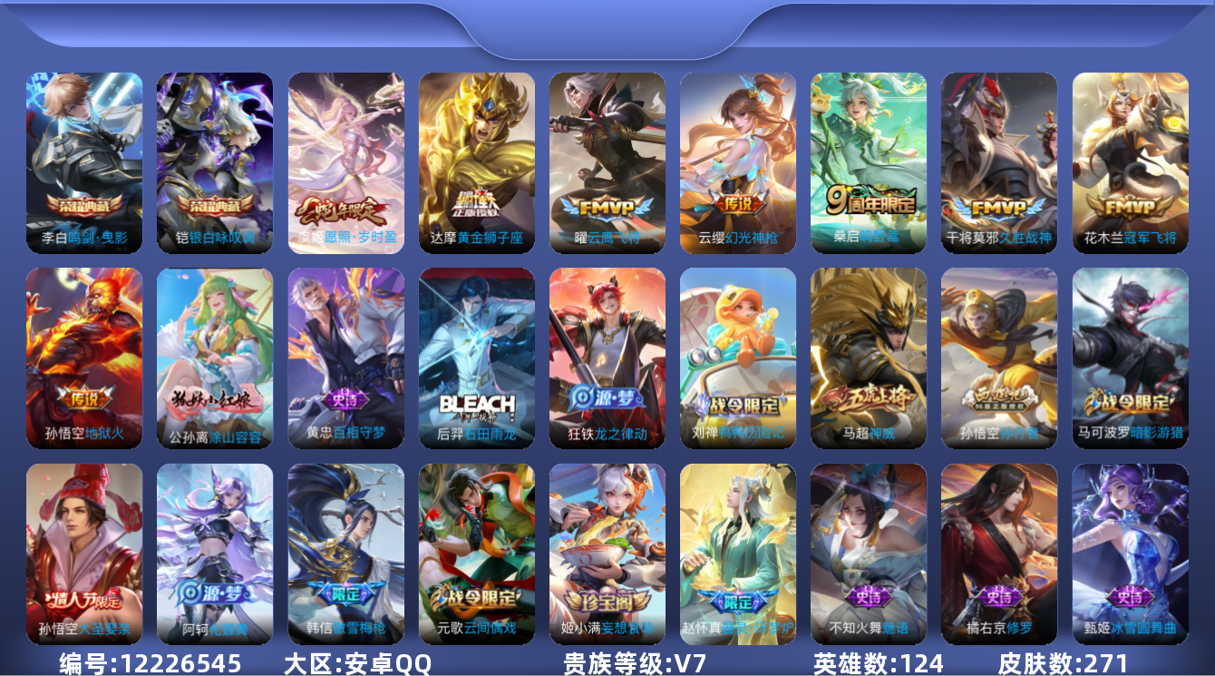 [12226545]V7 2典藏 8传说 124英雄 271皮肤 可修改实名 优质装备:鸣剑·曳影,银白咏叹调(倪克斯侍卫),黄金狮子座,冠军飞将,云鹰飞将(小将军),久胜战神,地狱火,涂山容容 传说皮:幻光神枪 珍宝阁皮:妄想食味,女武神,玩趣恶龙 限定皮:愿照·岁时盈(虞姬年限),鸣野蒿,傲雪梅枪,时之彼端,神威(电光马子),遇见飞天,高山流水,五谷丰年,李小龙,孙行者,大圣娶亲 史诗皮:鸭鸭历险记-刘禅,器灵·浮梦炉,化蝶舞,龙之律动,石田雨龙,茶境仙,百相守梦-黄忠,紫霞仙子,黄金分割率,特工魅影,千年之狐,江河有灵,魅语,高渐离燃音魔法,冰冠公主,末日机甲-吕布,猫狗日记-孙策,乱世虎臣,修罗,女仆咖啡,摇滚巨星,水果甜心,天才门将,星夜王子,心灵骇客,功夫厨神,德古拉伯爵,暗隐猎兽者,幽灵船长,鬼剑武藏,暗渊魔法,心灵战警,乐园奇幻夜,舞动绿茵,地狱岩魂,纤云弄巧,拒霜思,缤纷独角兽,乘风破浪,逐浪之夏,水晶猎龙者,曙光守护者,箭羽风息,金属风暴,原初追逐者,圣诞狂欢,圣诞恋歌,鹰眼统帅,魅力维加斯,赏金猎手,无心,未来纪元-赵云