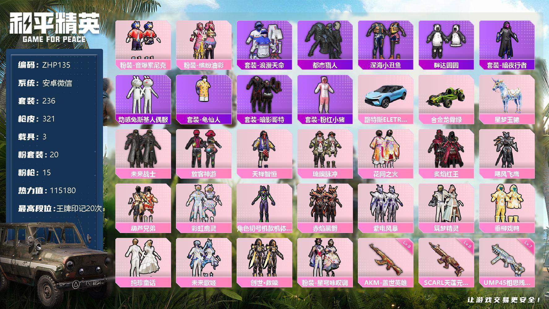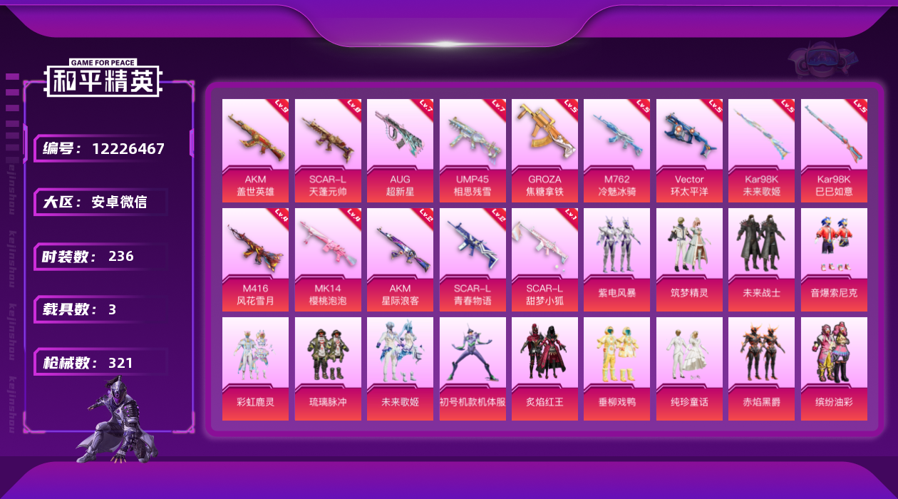 [12226467]【商品标题】:安卓 8级天蓬9级盖世!紫螳螂猪妹放客深海哥特都市!微信-20粉装-15特效枪-3载具-5粉色飞行器-115180热力值-20王牌印记-236套装-321枪皮