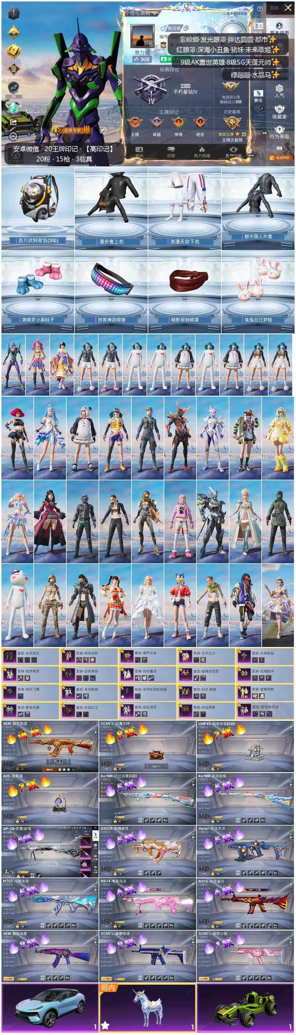 - [12039912]【暑期末清货/特价急出/永久包赔】:苹果 手Q-4粉装-5特效枪-5载具-6.9w热力值-11印记-173套装-199枪皮【热门品类】:套装-浪客战士,套装-SS1特训【稀有载具】:特斯拉Model 3(珍珠白),特斯拉Model X(珍珠白),阿斯顿马丁DBS(红),玛莎拉蒂Ghibli(粉),合金龙骨(蓝)【特效枪等级】:M416-心之恋语(七级),M762-鬼刀(三级),Kar98K-伏魔团(四级),Kar98K-巳巳如意(五级),DP-28-豹影疾电(一级)【优质套装】:粉装-俏皮狐尾,粉装-草莓生巧,粉装-香水柠檬,角色-零号机款机体服【优质飞行器】:梦幻火箭飞行器