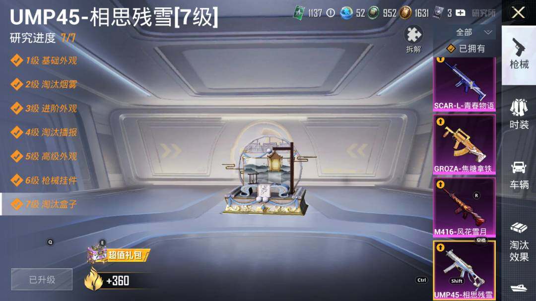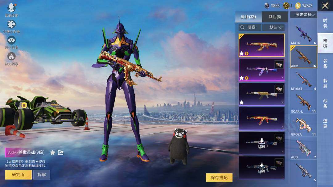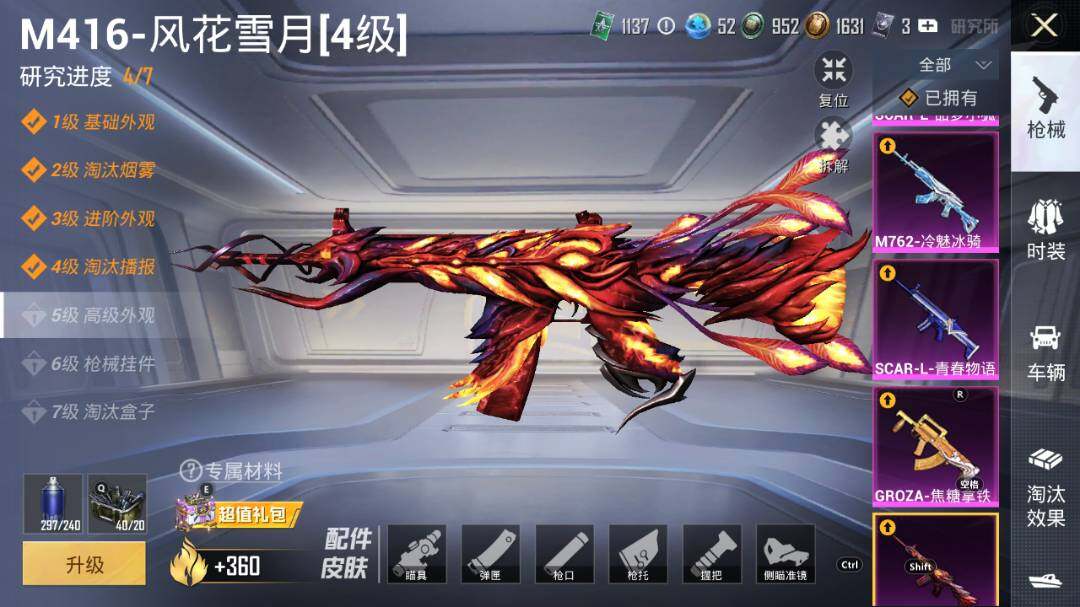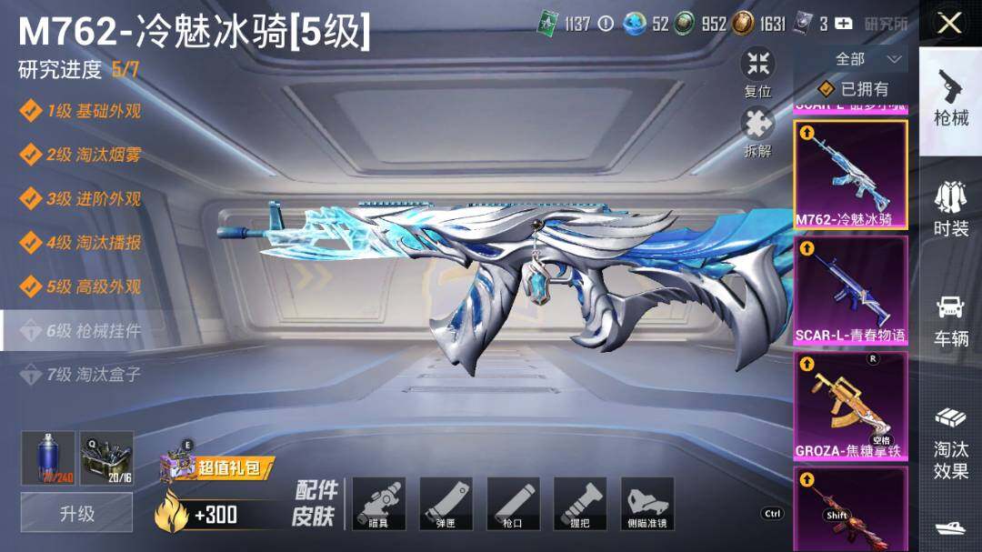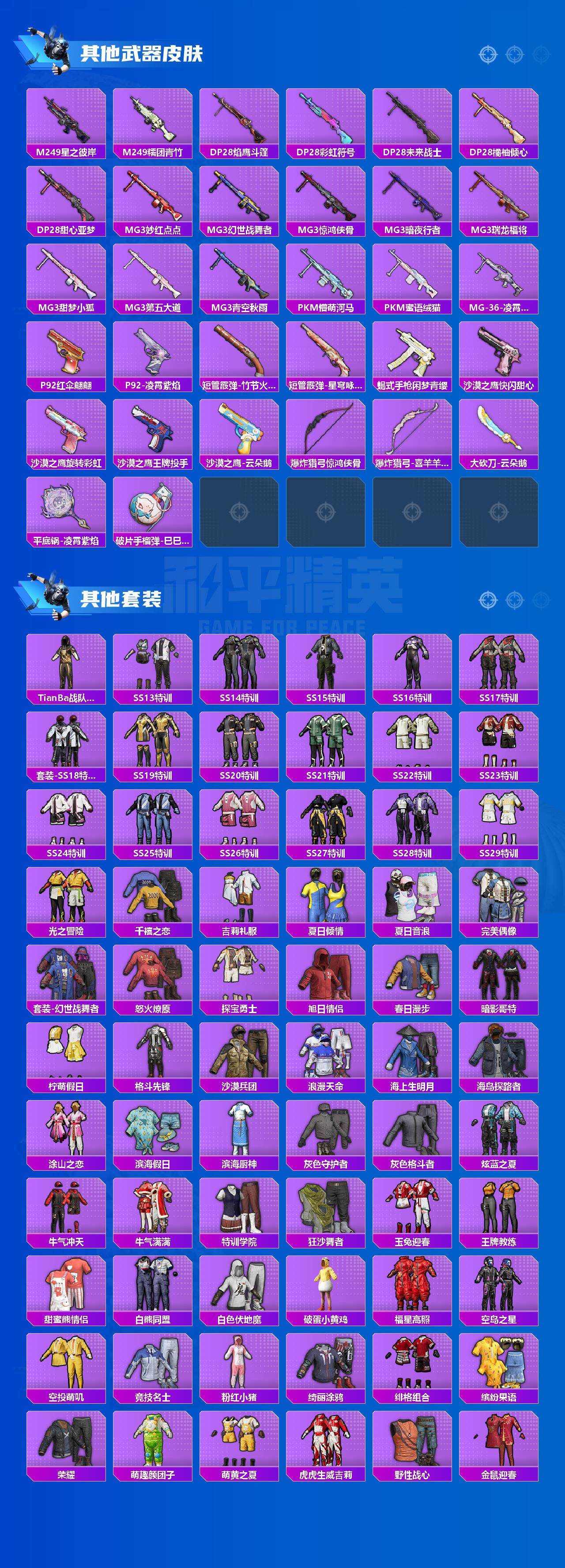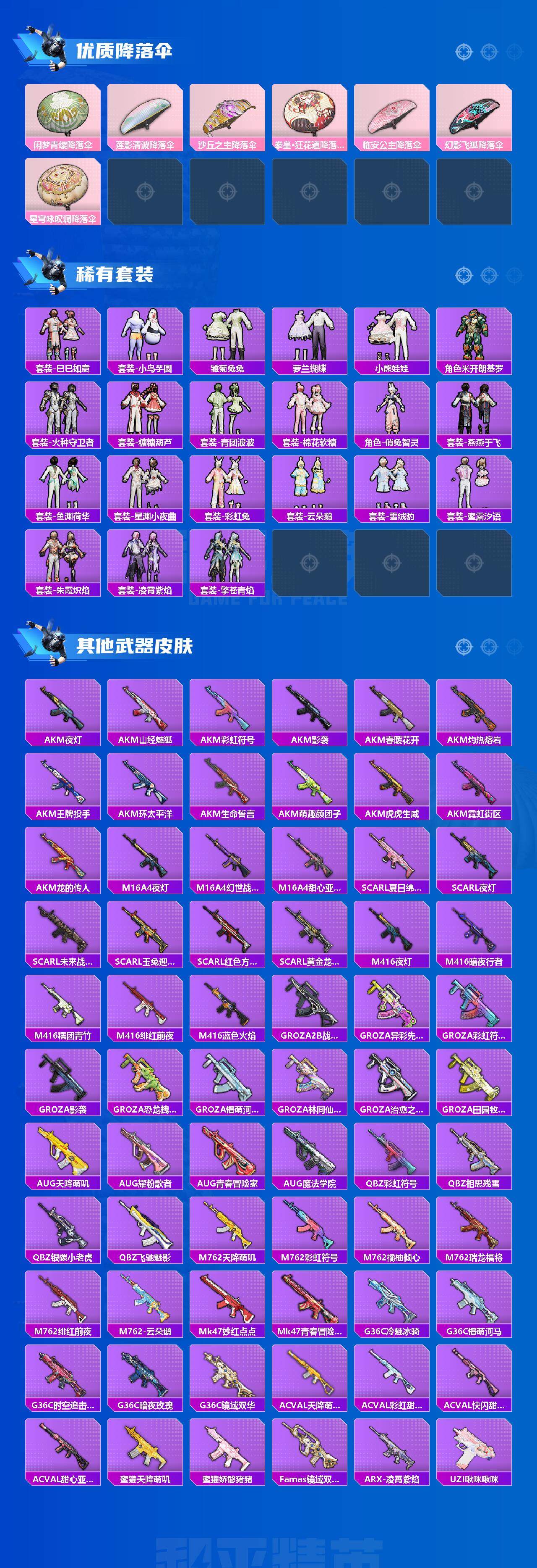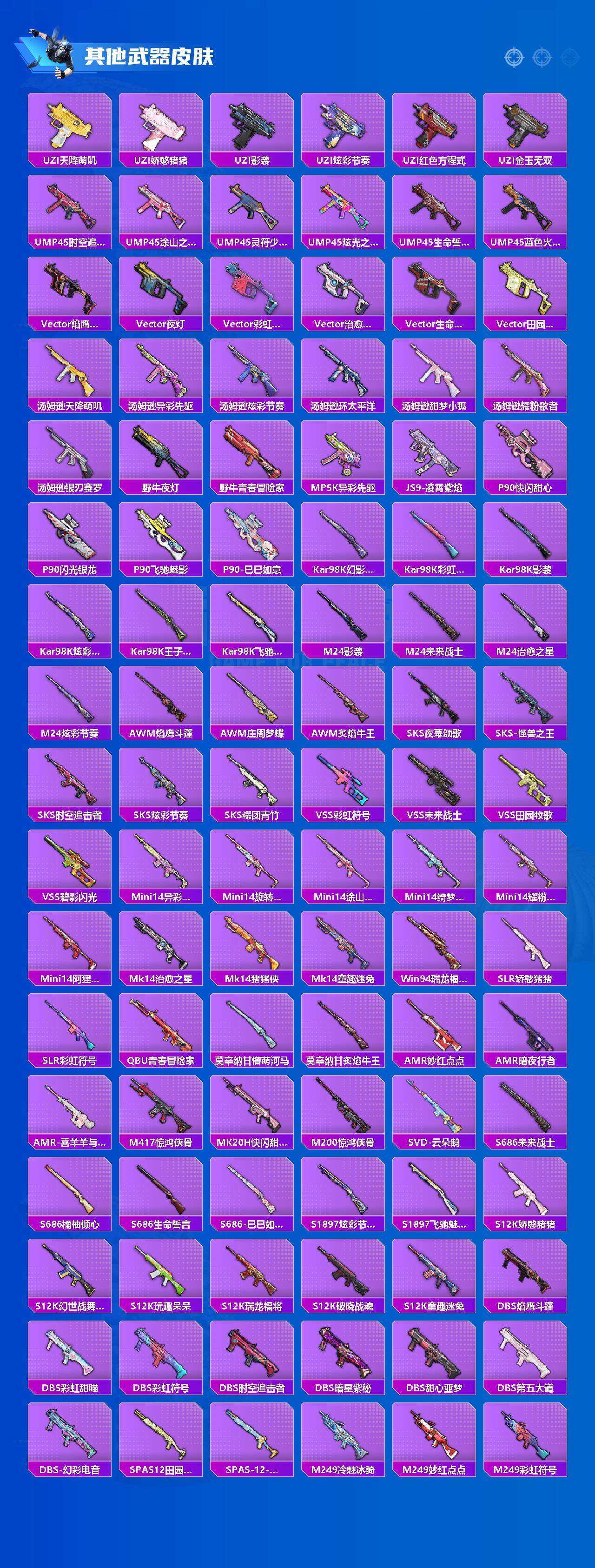 AKM-星际浪客,AKM-盖世英雄,SCAR-L-青春物语,SCAR-L-甜梦小狐,SCAR-L-天蓬元帅,M416-风花雪月,GROZA-焦糖拿铁,AUG-超新星,M762-冷魅冰骑,UMP45-相思残雪,Vector-环太平洋,Kar98K-未来歌姬,Kar98K-巳巳如意,Mk14-樱桃泡泡