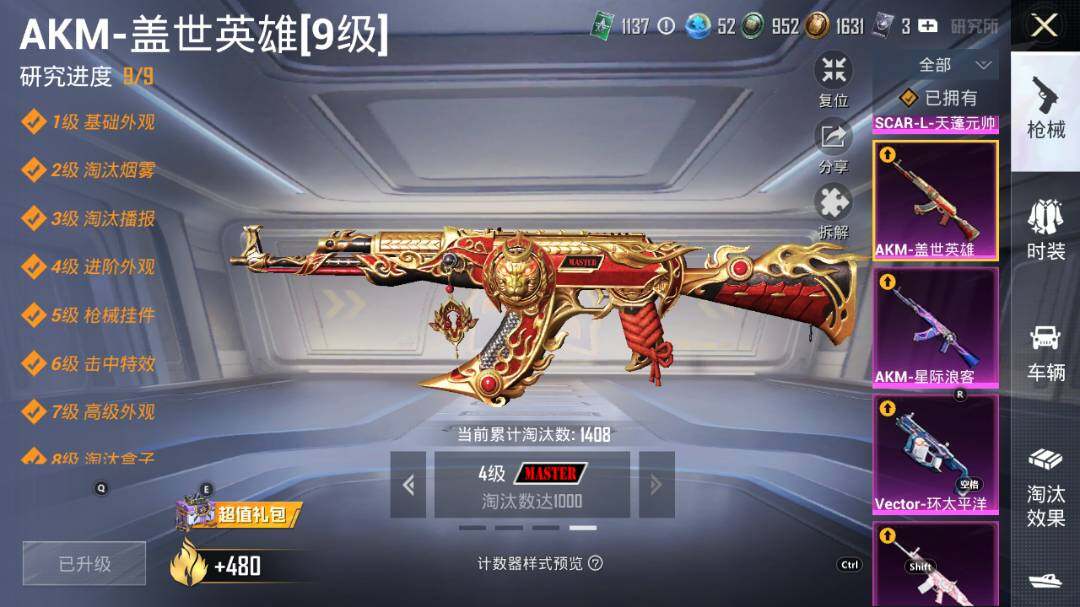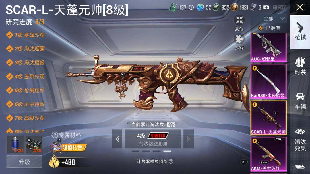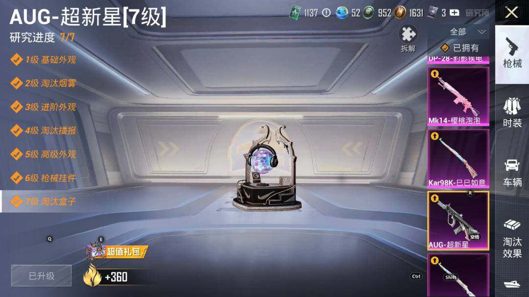 【粉色枪皮等级】:AKM-星际浪客(二级),AKM-盖世英雄(九级),SCAR-L-青春物语(二级),SCAR-L-甜梦小狐(一级),SCAR-L-天蓬元帅(八级),M416-风花雪月(四级),GROZA-焦糖拿铁(五级),AUG-超新星(七级),M762-冷魅冰骑(五级),UMP45-相思残雪(七级),Vector-环太平洋(五级),Kar98K-未来歌姬(五级),Kar98K-巳巳如意(五级),Mk14-樱桃泡泡(四级),DP-28-豹影疾电(五级)