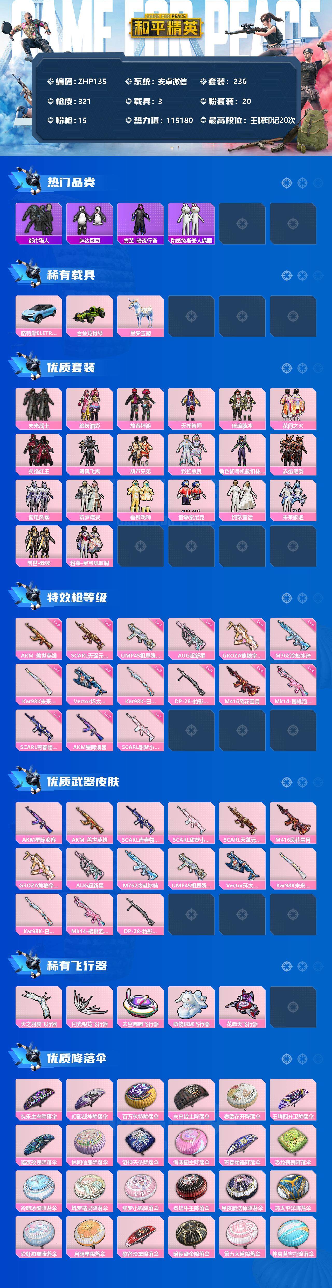 [12226467]【商品标题】:安卓 8级天蓬9级盖世!紫螳螂猪妹放客深海哥特都市!微信-20粉装-15特效枪-3载具-5粉色飞行器-115180热力值-20王牌印记-236套装-321枪皮 【热门品类】:粉装-音爆索尼克,粉装-缤纷油彩,套装-浪漫天命,套装-都市猎人,套装-深海小丑鱼,套装-胖达圆圆,套装-暗夜行者,套装-动感兔斯基人偶服,套装-龟仙人,套装-暗影哥特,套装-粉红小猪 【粉色载具】:路特斯ELETRE(冰川蓝),合金龙骨(绿),星梦玉骢 【粉色套装】:粉装-未来战士,粉装-缤纷油彩,粉装-放客神游,粉装-天禅智恒,粉装-琉璃脉冲,粉装-花间之火,粉装-炙焰红王,粉装-飓风飞鹰,粉装-葫芦兄弟,粉装-彩虹鹿灵,角色-初号机款机体服,粉装-赤焰黑爵,粉装-紫电风暴,粉装-筑梦精灵,粉装-垂柳戏鸭,粉装-音爆索尼克,粉装-纯珍童话,粉装-未来歌姬,套装-创世·救赎,粉装-星穹咏叹调 【粉色枪皮等级】:AKM-星际浪客(二级),AKM-盖世英雄(九级),SCAR-L-青春物语(二级),SCAR-L-甜梦小狐(一级),SCAR-L-天蓬元帅(八级),M416-风花雪月(四级),GROZA-焦糖拿铁(五级),AUG-超新星(七级),M762-冷魅冰骑(五级),UMP45-相思残雪(七级),Vector-环太平洋(五级),Kar98K-未来歌姬(五级),Kar98K-巳巳如意(五级),Mk14-樱桃泡泡(四级),DP-28-豹影疾电(五级) 【粉色枪皮】:AKM-星际浪客,AKM-盖世英雄,SCAR-L-青春物语,SCAR-L-甜梦小狐,SCAR-L-天蓬元帅,M416-风花雪月,GROZA-焦糖拿铁,AUG-超新星,M762-冷魅冰骑,UMP45-相思残雪,Vector-环太平洋,Kar98K-未来歌姬,Kar98K-巳巳如意,Mk14-樱桃泡泡,DP-28-豹影疾电 【粉色飞行器】:天之羽翼飞行器,闪光银龙飞行器,太空嘟嘟飞行器,萌物绒绒飞行器,花傲天飞行器 【粉色降落伞】:快乐主宰降落伞,幻影战神降落伞,百万伏特降落伞,未来战士降落伞,春暖花开降落伞,王牌四分卫降落伞,暗夜玫瑰降落伞,林间仙鹿降落伞,洛神天依降落伞,海渊国主降落伞,青春物语降落伞,恐龙拽拽降落伞,冷魅冰骑降落伞,筑梦精灵降落伞,甜梦小狐降落伞,炙焰牛王降落伞,星夜魔法师降落伞,环太平洋降落伞,彩虹甜喵降