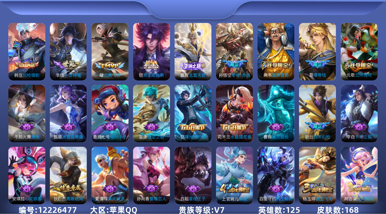 [12226477]V7 1典藏 5传说 125英雄 168皮肤 可修改实名 优质装备:弑枪猎影(韩信典藏),云鹰飞将(小将军),一念神魔,零号·赤焰,玄雷天君 传说皮:铠冥王哈迪斯 珍宝阁皮:蔷薇恋人 限定皮:逐霄战戟,遇见飞天,高山流水,梁祝,百木心枪 史诗皮:撼地雄心,破空之剑,蒙犽顽岩魄,埋骨钱,苍穹之光,电玩小子(小书包),特工魅影,千年之狐,江河有灵,真我赫兹(百里守约),魅语,百解令(蒙犽),猫狗日记-孙策,乱世虎臣,摇滚巨星,水果甜心,星夜王子,心灵骇客,功夫厨神,德古拉伯爵,暗隐猎兽者,幽灵船长,鬼剑武藏,心灵战警,乘风破浪,逐浪之夏,水晶猎龙者,曙光守护者,金属风暴,圣诞恋歌,鹰眼统帅,魅力维加斯,未来纪元-赵云