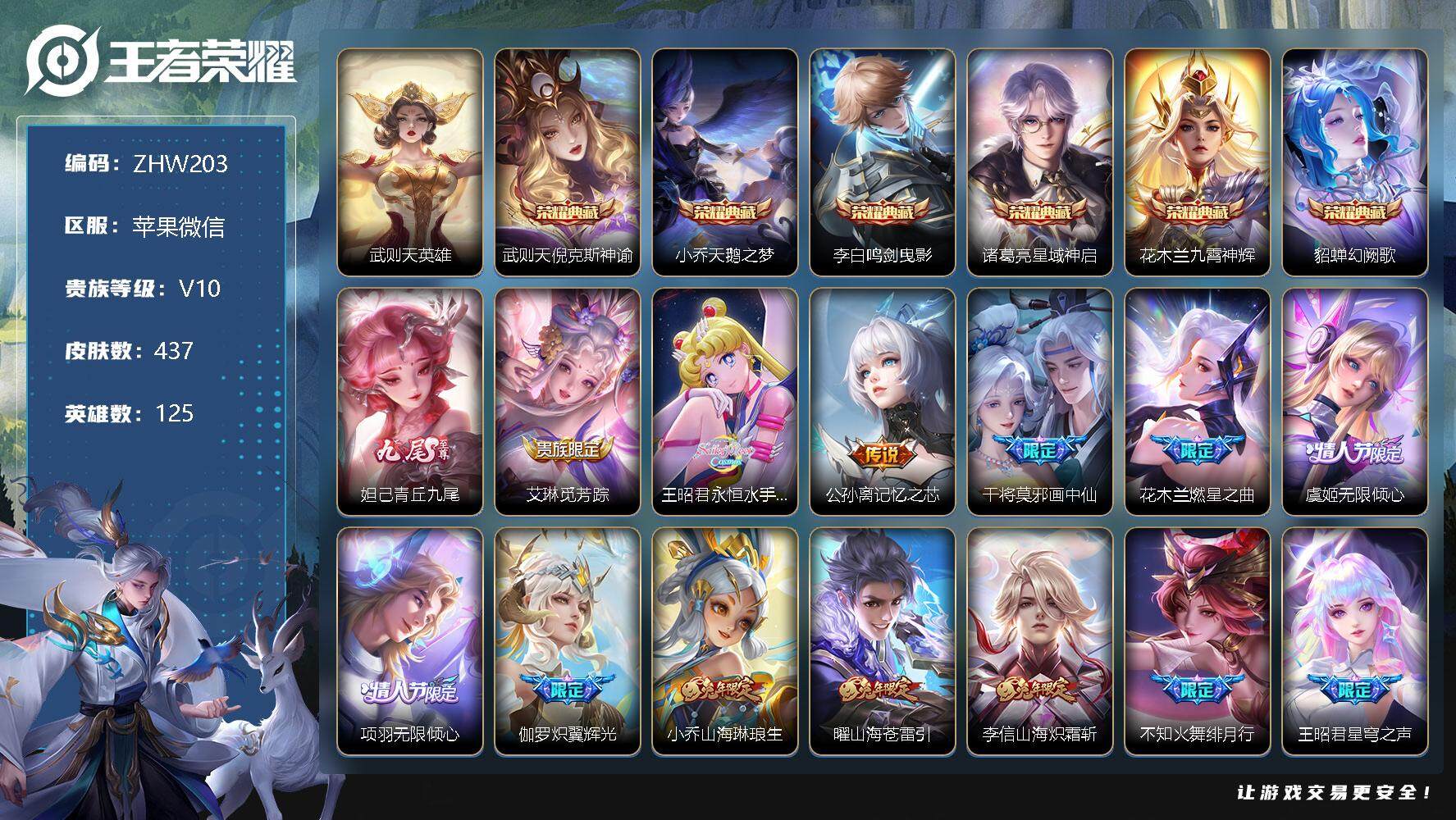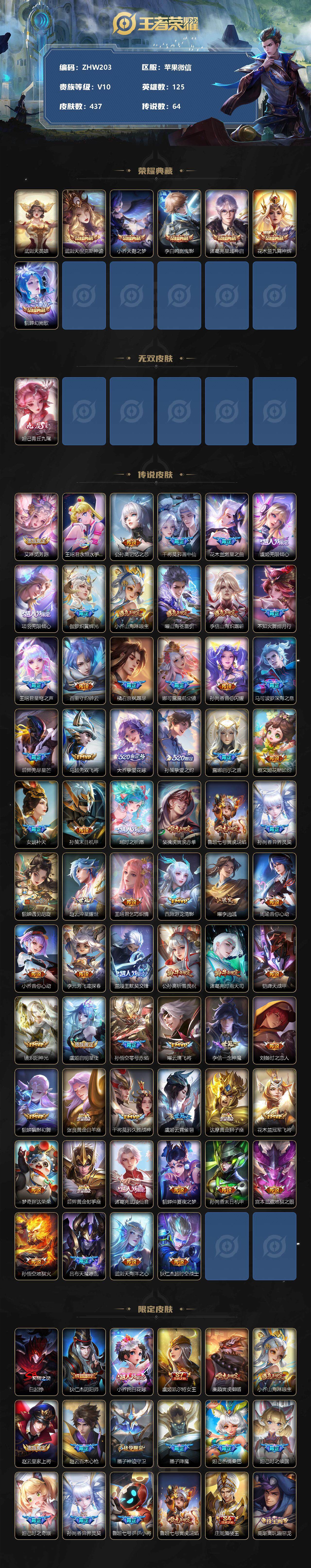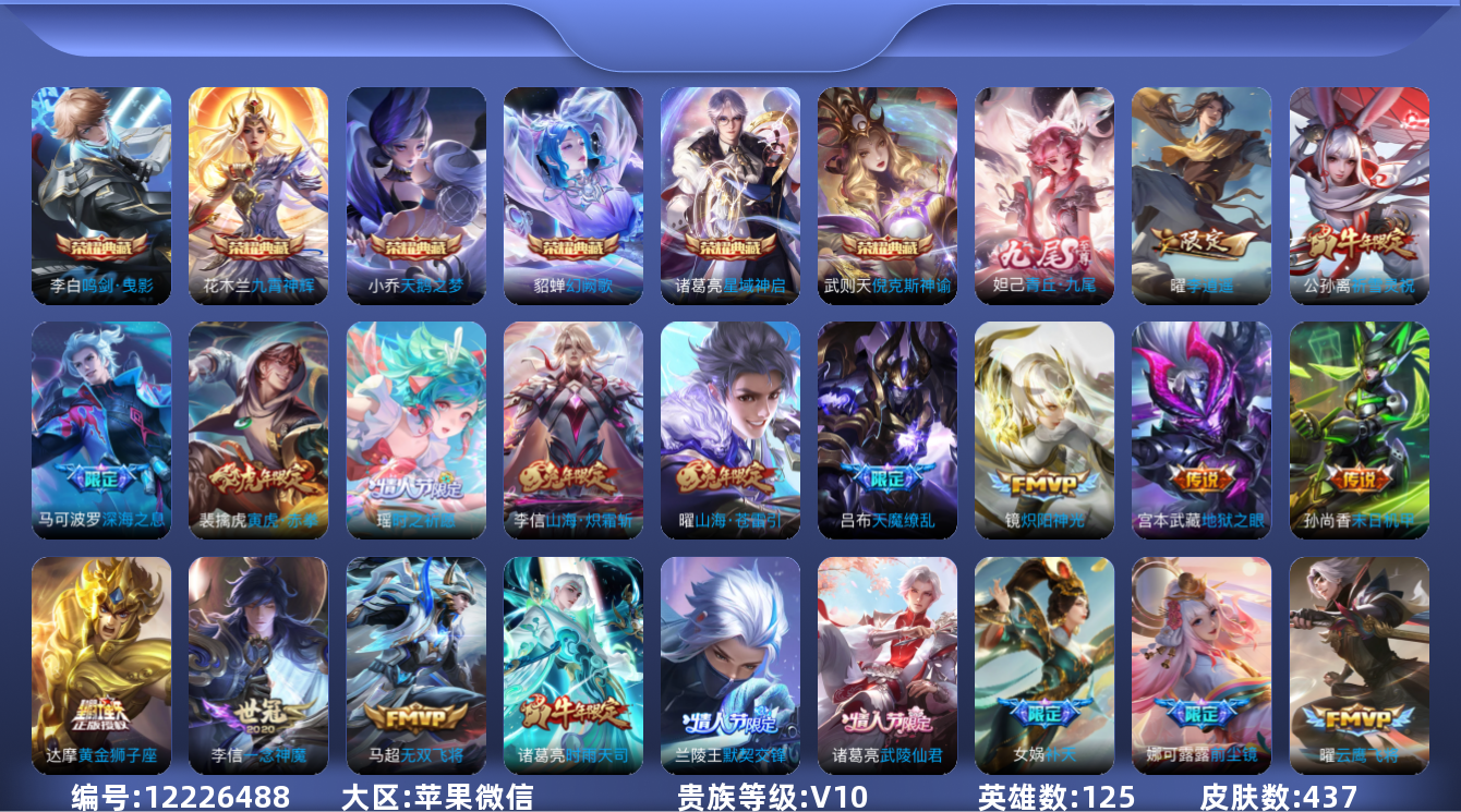 [12226488]【商品标题】:苹果WX-V10-最强王者段位-125英雄-437皮肤-6典藏-0珍品无双-1无双-0珍品传说-64传说-151史诗