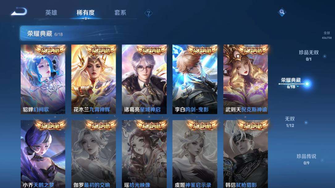 【荣耀典藏】:武则天英雄,武则天倪克斯神谕,小乔天鹅之梦,李白鸣剑曳影,诸葛亮星域神启,花木兰九霄神辉,貂蝉幻阙歌