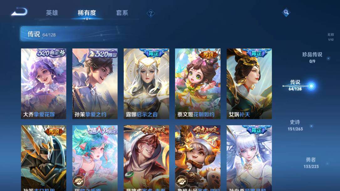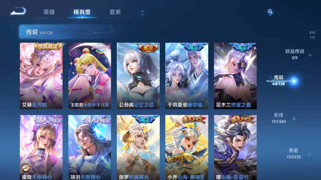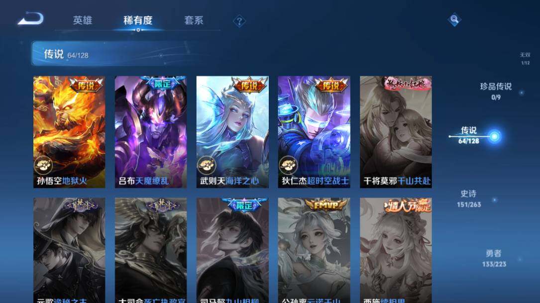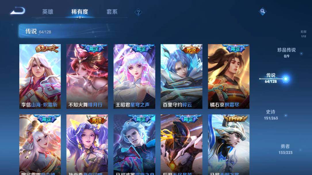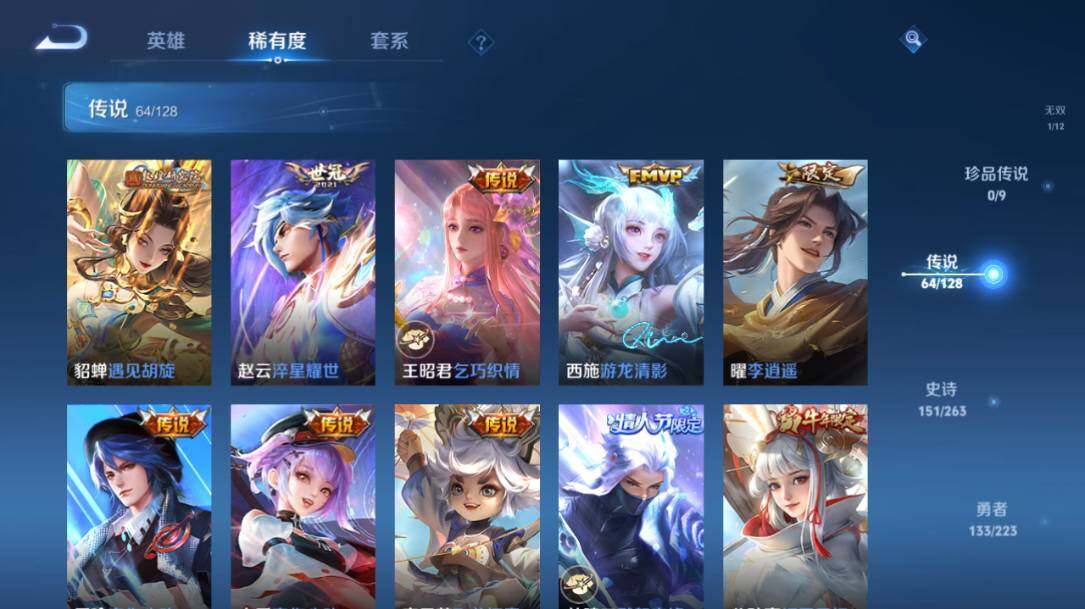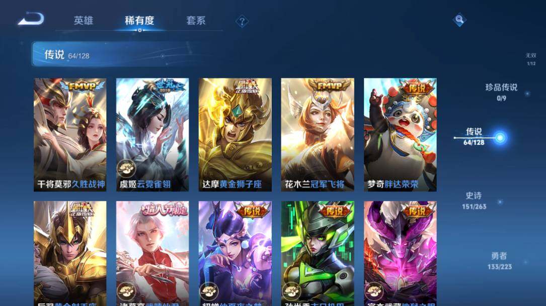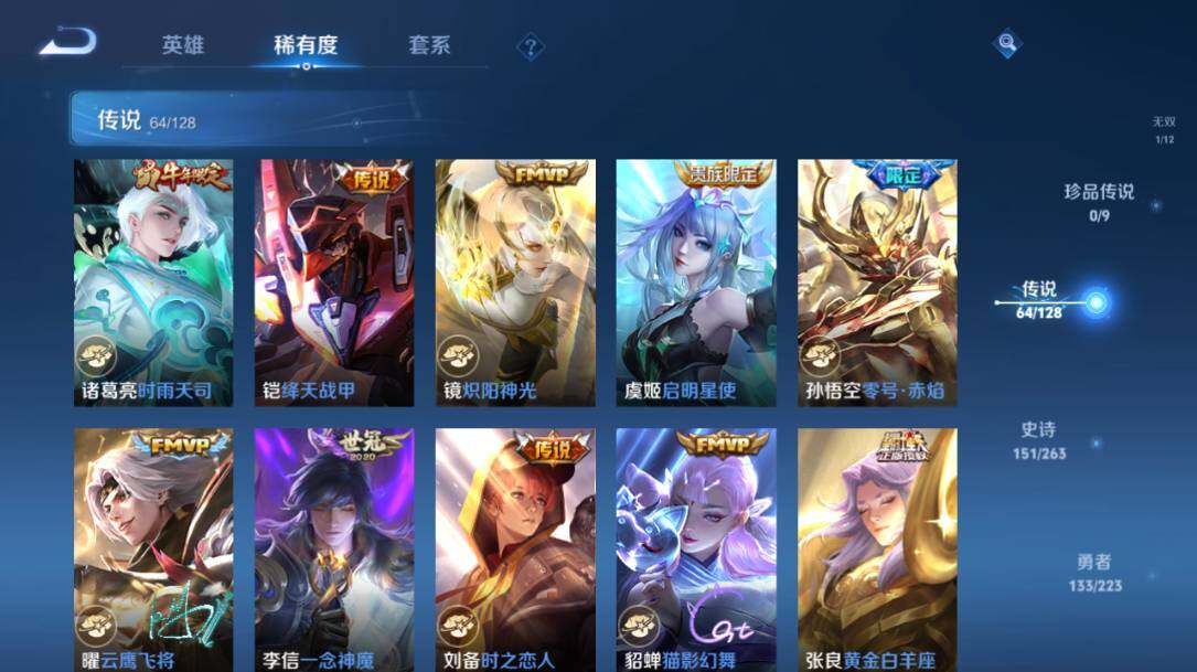 - PX_2104839-Q/至尊星耀/216皮肤/123英雄/0典藏/0珍品无双/0无双/1珍品传说/12传说/52史诗/7稀有英雄 【1 珍品传说】怪盗基德 马可波罗, 【12 传说皮肤】白虎志 百里玄策,零号·赤焰 孙悟空,齐天大圣 孙悟空,地狱之眼 宫本武藏,炽阳神光 镜,黄金射手座 后羿,久胜战神 干将莫邪,一念神魔 李信,妄想实况 马可波罗,超时空战士 狄仁杰,黄金白羊座 张良,鸣野蒿 桑