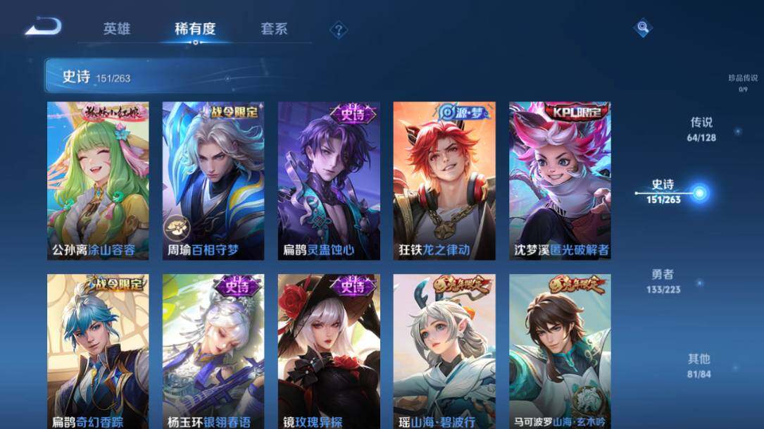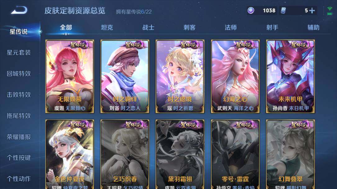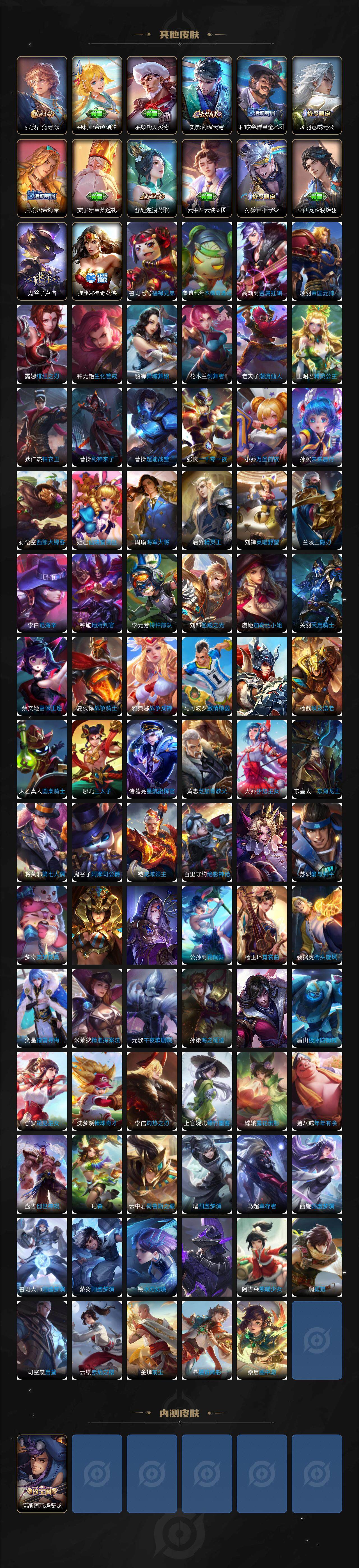 庄周蜃楼王,孙膑妖精王,扁鹊炼金王,虞姬凯尔特女王,白起狰,太乙真人饕餮,芈月重明,典韦穷奇,狂铁御狮,米莱狄御霄,牛魔御旌,夏侯惇朔风刀,明世隐疑决卦,老夫子醍醐杖,鬼谷子原初探秘者,狄仁杰万华元夜,程咬金演武夺筹,女娲朔望之晖,典韦蓝屏警告,沈梦溪星空之诺,李元芳银河之约,刘邦夺宝奇兵,马可波罗暗影游猎,蒙犽狂想玩偶喵,元歌云间偶戏,弈星混沌棋,达摩沙漠行僧,兰陵王金庭之子,沈梦溪大漠名商,李元芳云中旅人,桑启海盐诗旅,裴擒虎擒涛扼浪,张良古海寻踪,项羽苍威无极