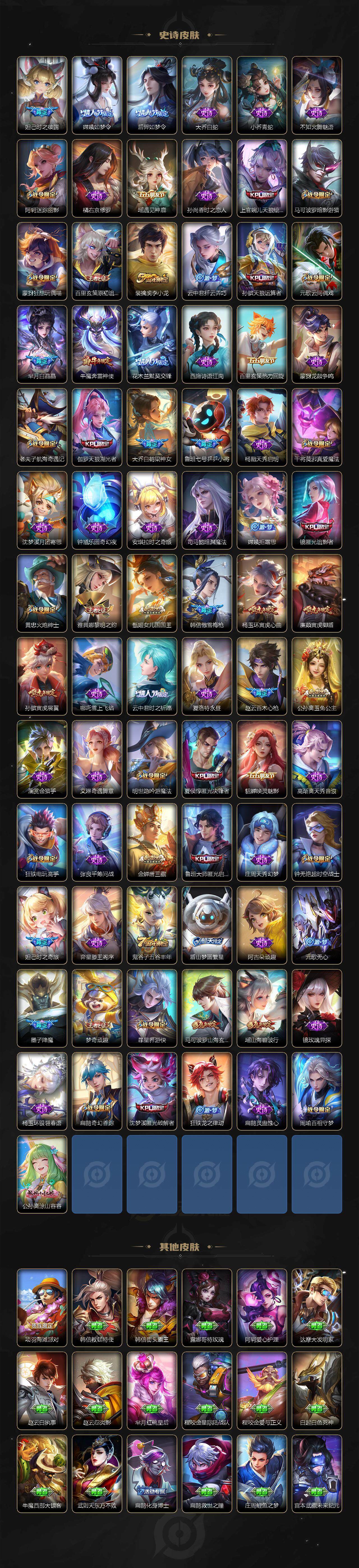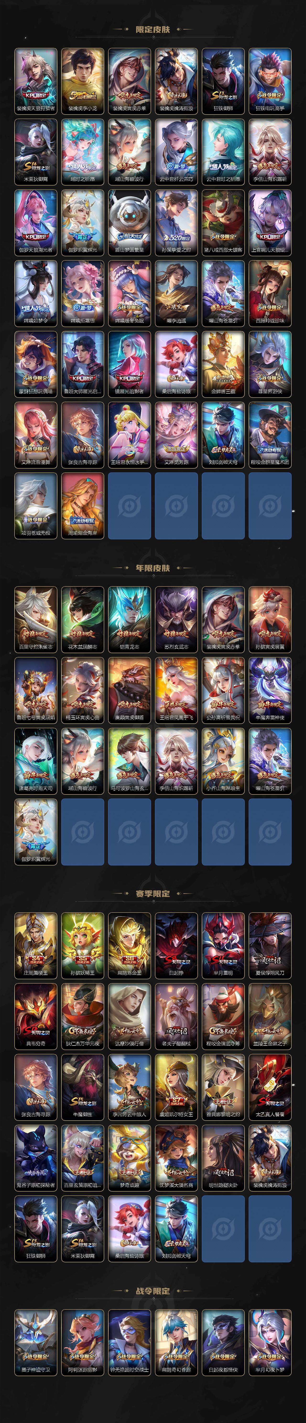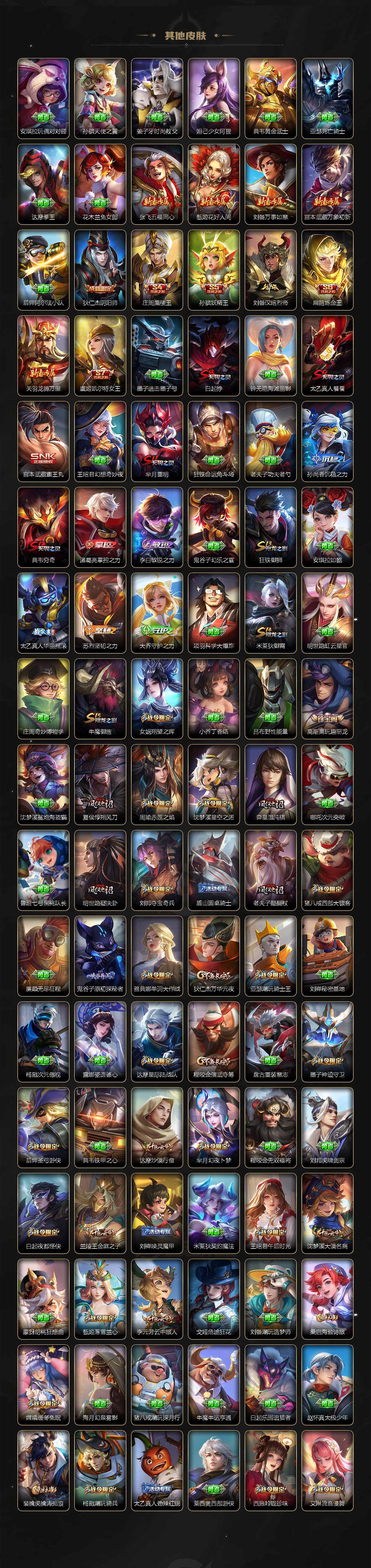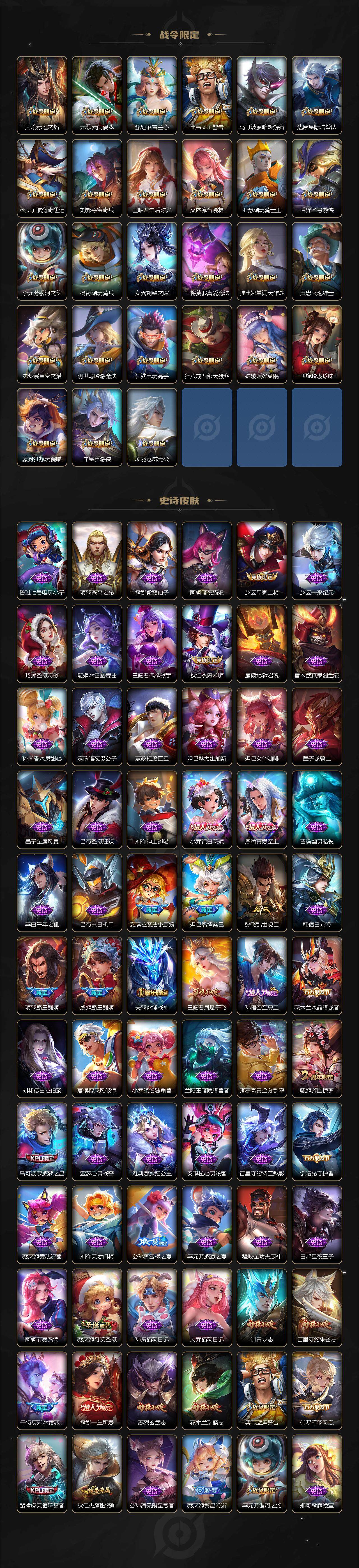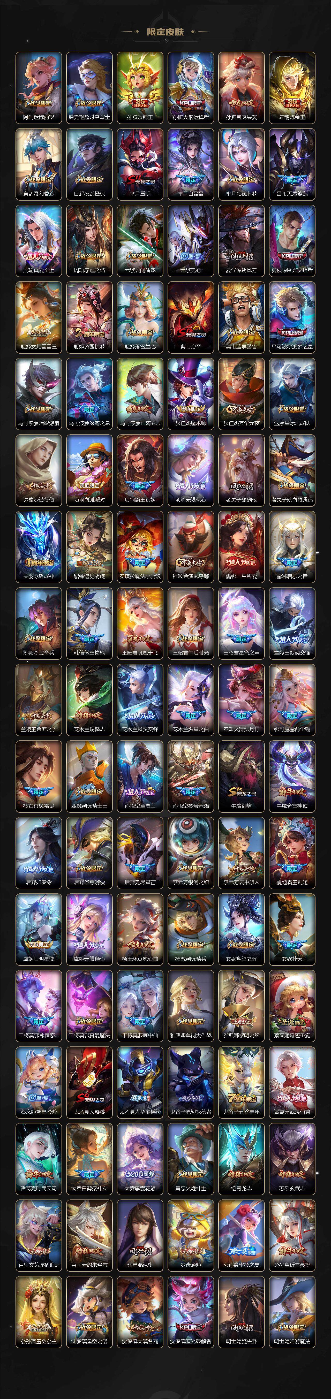 【限定皮肤】:白起狰,狄仁杰阴阳师,小乔纯白花嫁,虞姬凯尔特女王,廉颇寅虎御盾,小乔山海琳琅生,赵云皇家上将,赵云百木心枪,墨子神迹守卫,墨子降魔,妲己热情桑巴,妲己时之彼端,妲己时之奇旅,孙尚香异界灵契,鲁班七号乒乒小将,鲁班七号寅虎瑞焰,庄周蜃楼王,高渐离玩趣恶龙,阿轲迷踪丽影,钟无艳超时空战士,孙膑妖精王,孙膑天狼运算者,孙膑寅虎展翼,扁鹊炼金王,扁鹊奇幻香踪,白起夜都怪侠,芈月重明,芈月白晶晶,芈月幻夜卜梦,吕布天魔缭乱,周瑜真爱至上,周瑜赤莲之焰,元歌云间偶戏,元歌无心,夏侯惇朔风刀,夏侯惇匿光决锋者,甄姬女儿国国王,甄姬游园惊梦,甄姬落雪兰心,典韦穷奇,典韦蓝屏警告,马可波罗逐梦之星,马可波罗暗影游猎,马可波罗深海之息,马可波罗山海玄木吟,狄仁杰魔术师,狄仁杰万华元夜,达摩星际陆战队,达摩沙漠行僧,项羽海滩派对,项羽霸王别姬,项