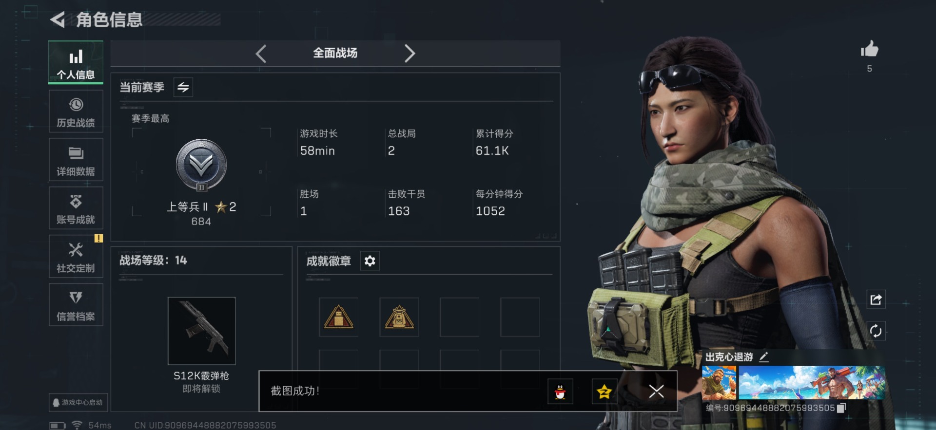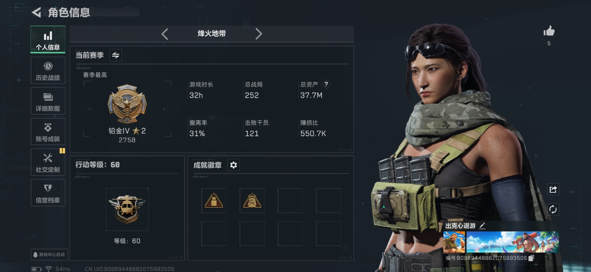 [12226785]总资产:37.7M 1干员外观 11传说枪械 哈夫币:30.028K 可二次 可修改实名 烽火地带段位:铂金 全面战场段位:上等兵 传说武器皮肤:K437突击步枪-几何解构,勇士冲锋枪-能天使-午夜邮差,M4A1突击步枪-阿米娅,CAR-15突击步枪-阿米娅,复合弓-黑-天际线,Vector冲锋枪-狩猎时刻,G3战斗步枪-狩猎时刻,M16A4突击步枪-狩猎时刻,AWM狙击步枪-捞点薯条,腾龙突击步枪-捞点薯条,93R-捞点薯条 史诗武器皮肤:AUG突击步枪-蝮蛇,SV-98狙击步枪-林中猎手,M1014霰弹枪-林中猎手,M16A4突击步枪-竞赛选手,勇士冲锋枪-工业狂潮,SV98狙击步枪-猎鳄行动,P90冲锋枪-紧急戒备,QJB201轻机枪-Old Habits,S12K霰弹枪-曙光,勇士冲锋枪-深海恐惧,AKM突击步枪-林中猎手 干员外观:露娜-黑·天际线