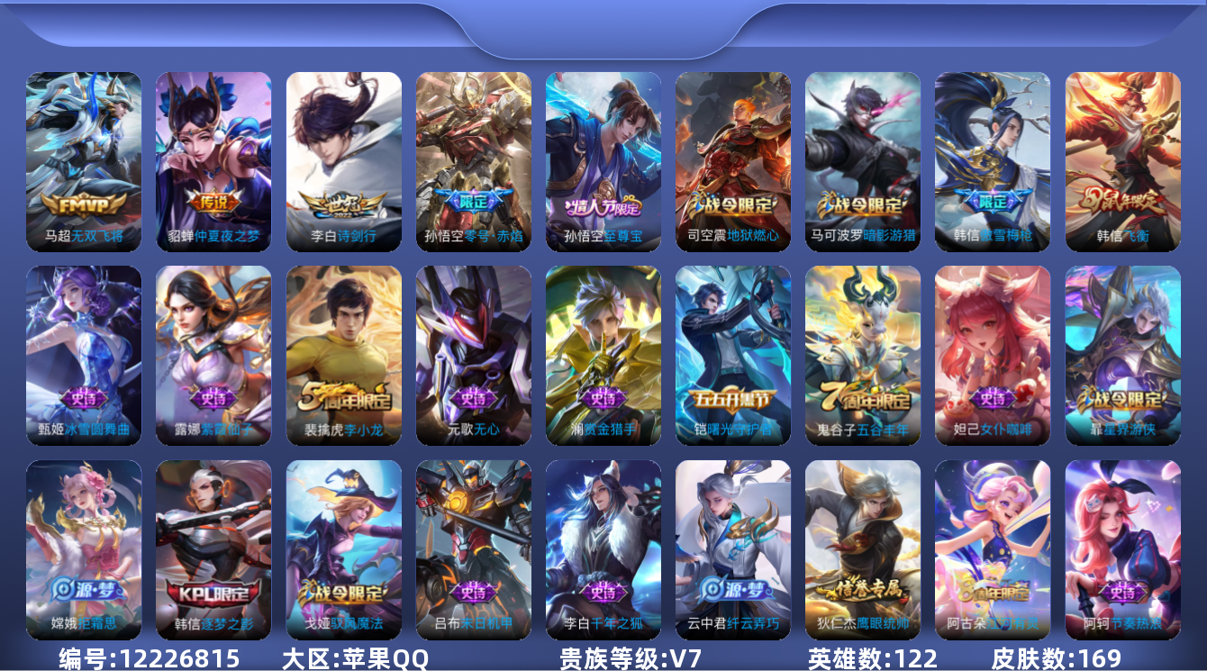 - PX_2067674-苹果Q 【可二次】 英雄数量:123 皮肤数量:216 贵族等级:贵族V8 无双限定1 荣耀典藏1 珍品传说1 传说品质21 史诗品质47器灵·螭龙剑 弑枪猎影 时之奇旅孙策 愿照·千秋盛 愿照·福禄聚 愿照·岁时盈 一念神魔 云鹰飞将 无双飞将 幻光神枪 千劫归真 愿照·山河定 愿照·众生和 愿照·九州拓 绯月行 浮生妄 怒海麟威 启明星使 鸣野蒿 霜月吟 战鼓燎原 乘龙淬