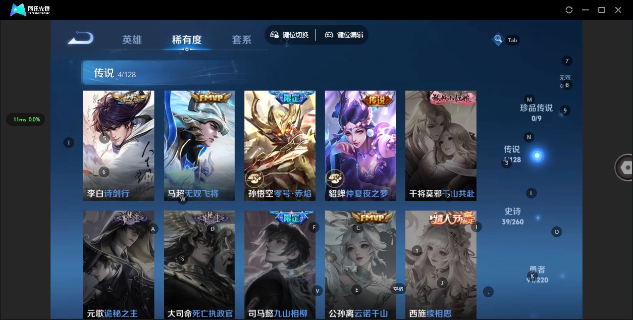 - [12263057]V6 8传说 118英雄 120皮肤 可修改实名 优质装备:云鹰飞将(小将军),一念神魔,无双飞将 传说皮:幻光神枪 珍宝阁皮:女武神 限定皮:愿照·九州拓(澜年限),愿照·山河定(司空震年限),鸣野蒿,诗剑行 史诗皮:破空之剑,蔬乡物语(鲁班七号),特工魅影,千年之狐,高渐离燃音魔法,偶像歌手,乱世虎臣,节奏热浪,女仆咖啡,摇滚巨星,水果甜心,绅士熊喵,天才门将,幽灵船长,鬼剑武藏,乘风破浪,逐浪之夏,圣诞狂欢,鹰眼统帅,魅力维加斯