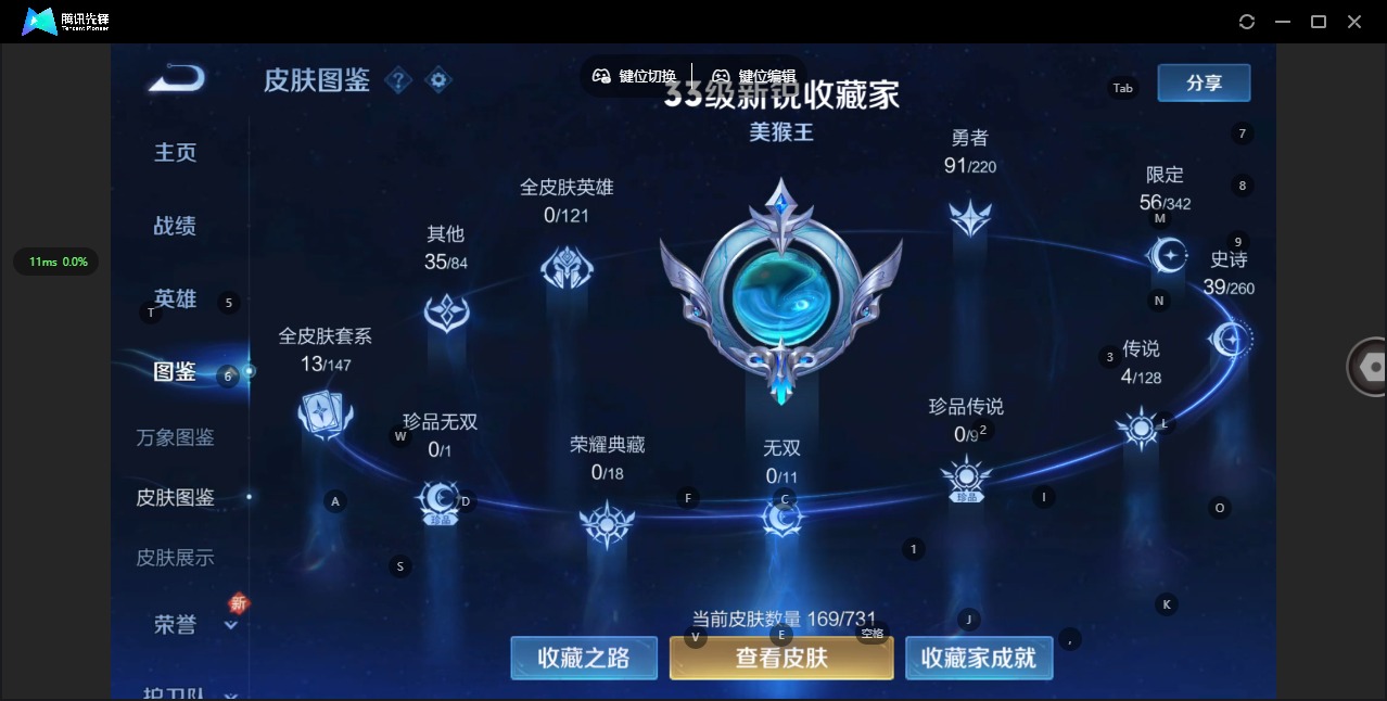- PX_2021280-贵族等级: V7 英雄数: 122 皮肤数: 200 传说皮: 云鹰飞将,炽阳神光,一念神魔,挚爱之约,无双飞将,山海·苍雷引,妄想实况 限定皮: 游园惊梦,朱雀志,匿光决锋者,五谷丰年,诗剑行,山海·碧波行