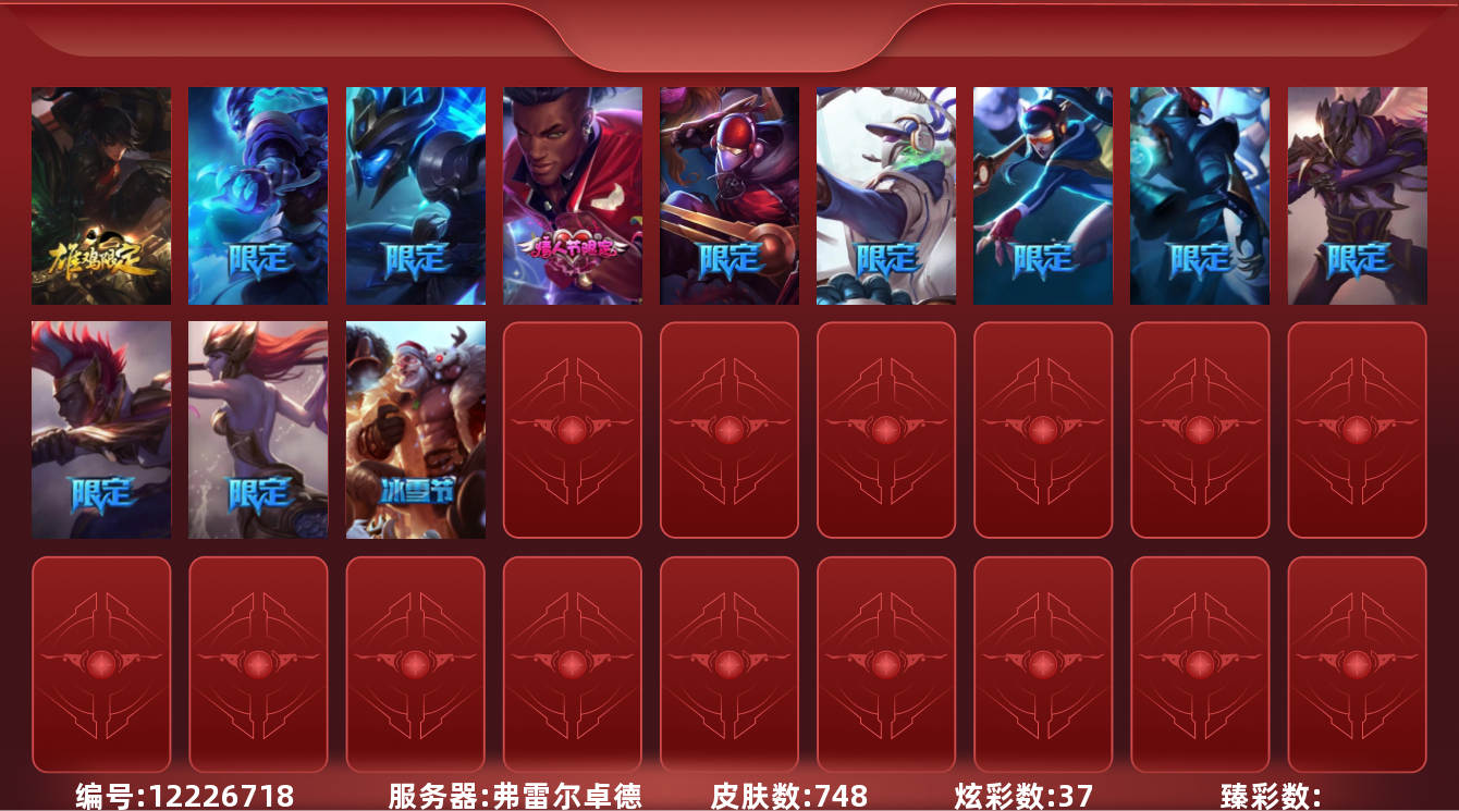 [12226718]可二次 可修改实名 4终极 4神话 8臻彩 146限定 65传说 207史诗 748皮肤 37炫彩 171英雄 翡翠 皮肤:雷霆领主 奥恩,暮星之羽 霞,晨星之翎 洛,巴德·吟游诗人,冰雪游神 巴德,永恒之森 巴德,SKT T1 卡莉丝塔,冠军之矛 卡莉丝塔,腥红之月 卡莉丝塔,泳池派对 雷克塞,上古战魂 雷克塞,抵抗军炎魔 俄洛伊,虚空使者 俄洛伊,暗星 锤石,SSW 锤石,腥红之月 锤石,冠军典狱长 锤石,深渊恐惧 锤石,司马懿 仲达,SKT T1 阿兹尔,幽冥领主 阿兹尔,星际之门 阿兹尔,SKT T1 娜美,海皇姬 娜美,鲛妮座人 娜美,河水之灵 娜美,锦鲤 娜美,狂鲨 亚托克斯,霸天剑魔 亚托克斯,仲裁圣骑 亚托克斯,源计划:裁决 蔚,虎痴之拳 蔚,炼狱魔女 蔚,铁拳执事 蔚,女警官 蔚,霓虹杀拳 蔚,SKT T1 艾克,源计划:自由 艾克,任性学霸 艾克,时之砂 艾克,爵士 克烈,SKT T1 劫,冲击之刃 劫,觅心游侠 卢锡安,源计划:雷 卢锡安,夺命前锋 卢锡安,职业杀手 卢锡安,海牛大大 塔姆,五星大厨 塔姆,圣诞捣蛋鬼 金克丝,丧尸杀手 金克丝,黑帮狂花 金克丝,银河魔装机神 千珏,黯焰双魂 千珏,源计划:升华 烬,SKT T1 烬,黑帮管家 布隆,圣诞老人 布隆,布隆·狮心,猛虎 布隆,屠龙勇士 布隆,源代码 卡蜜尔,弗雷尔卓德 塔莉垭
