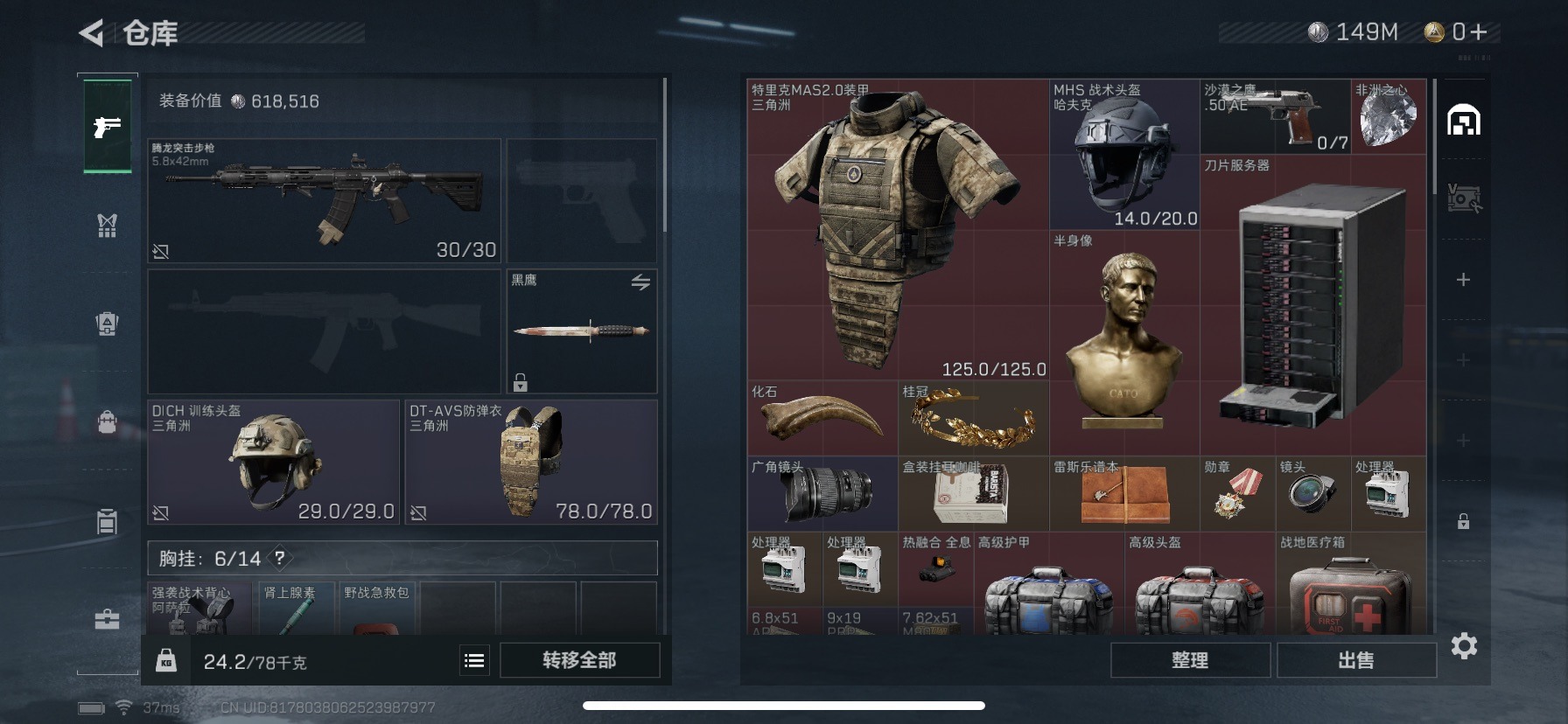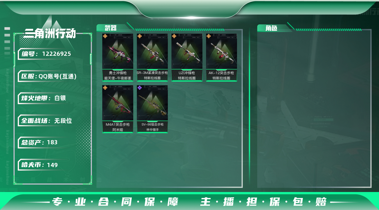 [12226925]总资产:183.6M 5传说枪械 哈夫币:149K 可二次 可修改实名 烽火地带段位:白银 全面战场段位:无段位 传说武器皮肤:M4A1突击步枪-阿米娅,AK-12突击步枪-特斯拉线圈,SR-3M紧凑突击步枪-特斯拉线圈,UZI冲锋枪-特斯拉线圈,勇士冲锋枪-能天使-午夜邮差 史诗武器皮肤:SV-98狙击步枪-林中猎手