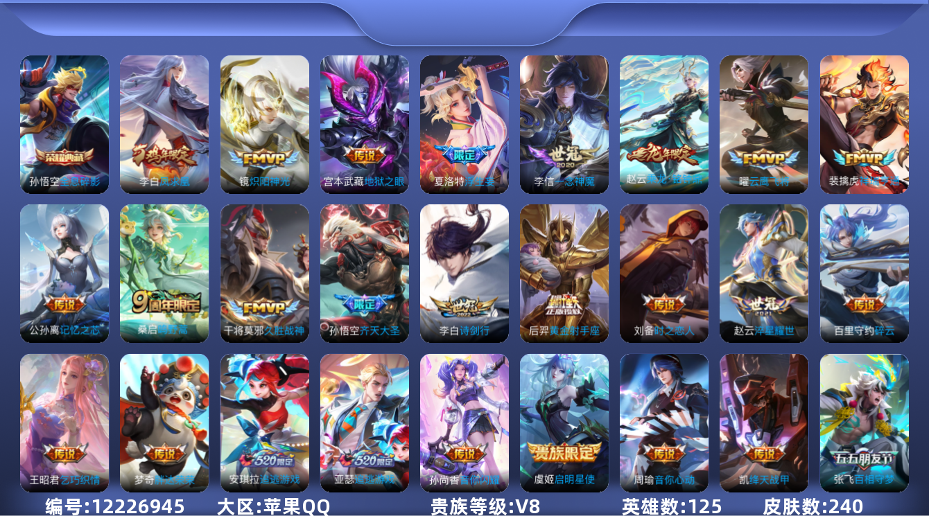 [12226945]V8 1典藏 26传说 125英雄 240皮肤 可修改实名 优质装备:全息碎影(猴子典藏),黄金射手座,云鹰飞将(小将军),绛天战甲(鸡嘴战神),久胜战神,炽阳神光,一念神魔,地狱之眼,音你心动-周瑜,胖达荣荣,乞巧织情,时之恋人-刘备(电焊工),淬星耀世,音你闪耀(rap皮),碎云,浮生妄,记忆之芯(机甲兔),百相守梦(张飞),追逃游戏(亚瑟),追逃游戏(安琪拉) 传说皮:乘龙·铭钟鼎(赵云年限),祥瑞亨通 珍宝阁皮:妄想食味 限定皮:鸣野蒿,至尊宝,凤求凰(白切鸡),神威(电光马子),飞衡(韩信年限),诗剑行,齐天大圣,降魔,五谷丰年,冰锋战神,龙胆,烈魂,虎魄,孙行者,山海·玄木吟(马可年限) 史诗皮:星界战将,龙之律动,蒙犽顽岩魄,蔬乡物语(鲁班七号),百相守梦-黄忠,遇见神鹿,紫霞仙子,电玩小子(小书包),魅语,匿光破解者,偶像歌手,白蛇,晚萤,电玩·爆裂旋风,百相守梦(刘备),暗夜猫娘,百相守梦(关羽),末日机甲-吕布,猫狗日记-孙策,猫狗日记-大乔,乱世虎臣,修罗,摇滚巨星,水果甜心,绅士熊喵,星夜王子,功夫厨神,暗隐猎兽者,幽灵船长,鬼剑武藏,乐园奇幻夜,地狱岩魂,缤纷独角兽,乘风破浪,逐浪之夏,水晶猎龙者,热力回旋,唤灵魅影,金属风暴,圣诞恋歌,鹰眼统帅,暗夜贵公子,魅力维加斯,雪上飞焰,赏金猎手,奇遇舞章,天秀·音浪