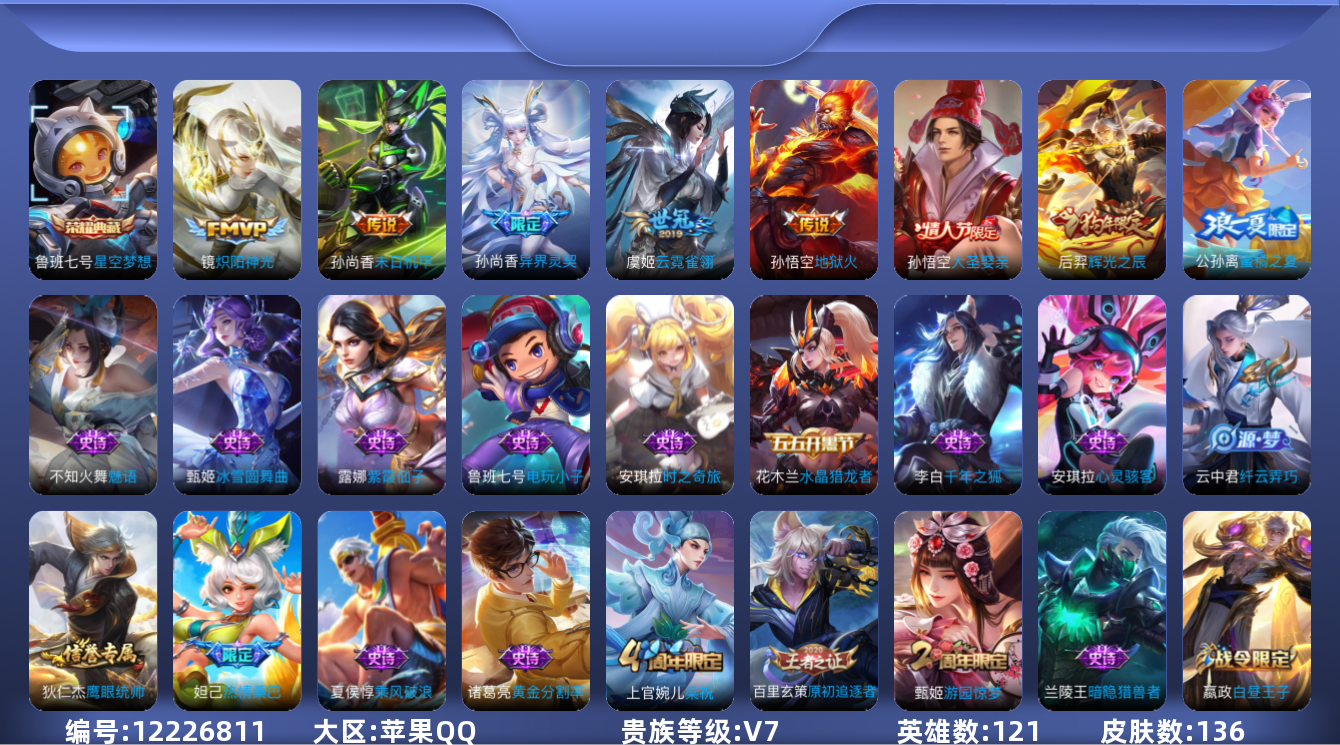 [12226811]V7 1典藏 5传说 121英雄 136皮肤 可修改实名 优质装备:星空梦想(太空人),炽阳神光,云霓雀翎,末日机甲-孙尚香(绿蚂蚱),地狱火 珍宝阁皮:玩趣恶龙 限定皮:异界灵契(白毛香),高山流水,游园惊梦,梁祝,辉光之辰,大圣娶亲,蜜橘之夏,热情桑巴 史诗皮:紫霞仙子,电玩小子(小书包),黄金分割率,千年之狐,魅语,冰冠公主,乱世虎臣,水果甜心,天才门将,心灵骇客,时之奇旅-安琪拉,暗隐猎兽者,鬼剑武藏,舞动绿茵,地狱岩魂,纤云弄巧,乘风破浪,逐浪之夏,水晶猎龙者,箭羽风息,金属风暴,原初追逐者,圣诞狂欢,圣诞恋歌,鹰眼统帅,王者之锤,暗夜贵公子,魅力维加斯,黎明之约
