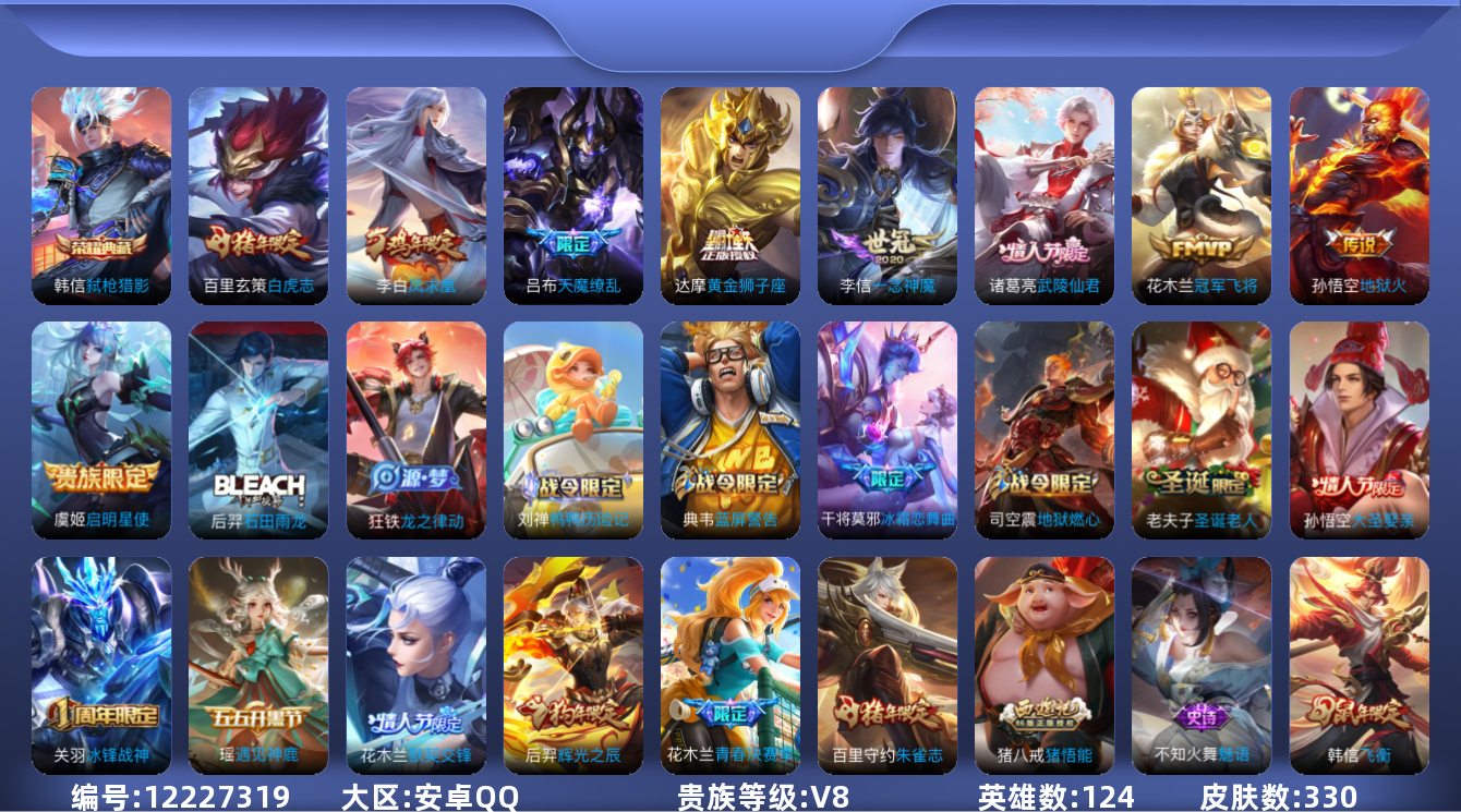 [12227319]V8 1典藏 9传说 124英雄 330皮肤 可修改实名 优质装备:弑枪猎影(韩信典藏),黄金狮子座,冠军飞将,一念神魔,地狱火 珍宝阁皮:优雅恋人,女武神 限定皮:白虎志(电光耗子),凤求凰(白切鸡),武陵仙君(小桃花),时之彼端,飞衡(韩信年限),瑞麟志(木兰年限),遇见飞天,高山流水,五谷丰年,冰锋战神,游园惊梦,梁祝,天狼狩猎者,天狼征服者,李小龙,逐梦之影,逐梦之光,朱雀志(守约年限),辉光之辰,霸王别姬-项羽,圣诞老人,默契交锋-花木兰,真爱至上,猪悟能,一生所爱,大圣娶亲,天魔缭乱,青春决赛季,冰霜恋舞曲 史诗皮:鸭鸭历险记-刘禅,龙之律动,石田雨龙,遇见神鹿,紫霞仙子,苍穹之光,白龙吟,黄金分割率,特工魅影,千年之狐,江河有灵,魅语,百解令(蒙犽),蒙恬荣光圣徽,冰冠公主,暗夜猫娘,末日机甲-吕布,猫狗日记-孙策,时之恋人-孙尚香,乱世虎臣,节奏热浪,修罗,女仆咖啡,摇滚巨星,水果甜心,绅士熊喵,天才门将,星夜王子,心灵骇客,功夫厨神,德古拉伯爵,暗隐猎兽者,幽灵船长,鬼剑武藏,乐园奇幻夜,舞动绿茵,地狱岩魂,纤云弄巧,繁星吟游(呼啦呼啦),拒霜思,缤纷独角兽,乘风破浪,逐浪之夏,水晶猎龙者,曙光守护者,箭羽风息,金属风暴,原初追逐者,圣诞狂欢,圣诞恋歌,鹰眼统帅,王者之锤,暗夜贵公子,魅力维加斯,黎明之约,无心,未来纪元-赵云