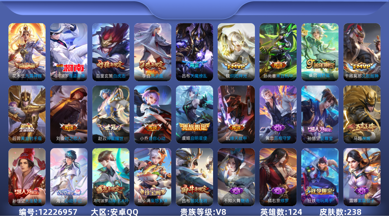 [12226957]V8 1典藏 1珍品传说 13传说 124英雄 238皮肤 可修改实名 优质装备:九霄神辉(木兰典藏),怪盗基德,黄金射手座,绛天战甲(鸡嘴战神),久胜战神,炽阳神光,末日机甲-孙尚香(绿蚂蚱),音你心动-小乔,时之恋人-刘备(电焊工),淬星耀世 珍宝阁皮:妄想食味,蔷薇恋人,玩趣恶龙 限定皮:鸣野蒿,至尊宝,白虎志(电光耗子),凤求凰(白切鸡),神威(电光马子),五谷丰年,游园惊梦,御风骁将(吕布年限),李小龙,大圣娶亲,天魔缭乱,山海·玄木吟(马可年限) 史诗皮:星界战将,怒海争锋,海诺心动手记,百相守梦-百里守约,百相守梦-黄忠,紫霞仙子,白龙吟,黄金分割率,魅语,蒙恬荣光圣徽,偶像歌手,猫狗日记-孙策,乱世虎臣,节奏热浪,修罗,女仆咖啡,水果甜心,绅士熊喵,星夜王子,功夫厨神,德古拉伯爵,暗隐猎兽者,鬼剑武藏,暗渊魔法,乐园奇幻夜,天秀·启明,纤云弄巧,乘风破浪,逐浪之夏,水晶猎龙者,曙光守护者,金属风暴,原初追逐者,圣诞恋歌,鹰眼统帅,魅力维加斯,黎明之约,无心