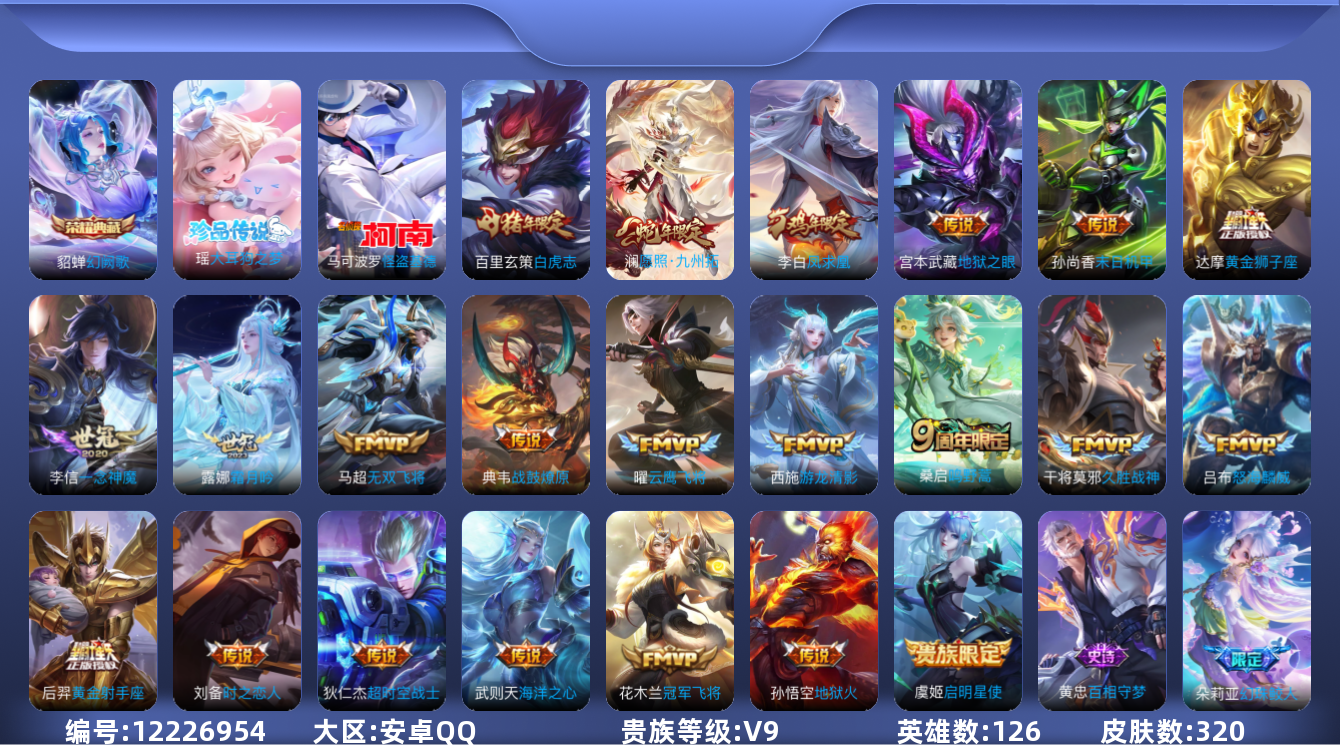 [12226954]V9 1典藏 2珍品传说 22传说 126英雄 320皮肤 典藏英雄武则天 可修改实名 优质装备:幻阙歌(貂蝉典藏),怪盗基德,大耳狗之梦,黄金狮子座,黄金射手座,冠军飞将,云鹰飞将(小将军),久胜战神,一念神魔,末日机甲-孙尚香(绿蚂蚱),地狱火,海洋之心,地狱之眼,时之恋人-刘备(电焊工),游龙清影(小青龙),超时空战士-狄仁杰,无双飞将,霜月吟 传说皮:典韦战鼓燎原 珍宝阁皮:妄想食味 限定皮:愿照·九州拓(澜年限),逐霄战戟,鸣野蒿,至尊宝,白虎志(电光耗子),凤求凰(白切鸡),寅虎·展翼(孙膑年限),魔法小厨娘,神威(电光马子),飞衡(韩信年限),怒海麟威,梁祝,李小龙,逐梦之影,大圣娶亲,神奇女侠 史诗皮:鸭鸭历险记-刘禅,器灵·浮梦炉,化蝶舞,星界战将,龙之律动,布丁狗之誓,百相守梦-周瑜,茶境仙,幻珠鲛人,东方月初,蒙犽顽岩魄,埋骨钱,百相守梦-百里守约,百相守梦-黄忠,紫霞仙子,苍穹之光,白龙吟,黄金分割率,特工魅影,千年之狐,魅语,高渐离燃音魔法,无限星赏官,冰冠公主,青蛇,偶像歌手,龙骑士(小龙虾),末日机甲-吕布,猫狗日记-孙策,猫狗日记-大乔,节奏热浪,修罗,女仆咖啡,摇滚巨星,水果甜心,绅士熊喵,天才门将,星夜王子,心灵骇客,功夫厨神,德古拉伯爵,暗隐猎兽者,鬼剑武藏,乐园奇幻夜,天秀·启明,纤云弄巧,繁星吟游(呼啦呼啦),缤纷独角兽,乘风破浪,逐浪之夏,水晶猎龙者,曙光守护者,箭羽风息,原初追逐者,圣诞狂欢,圣诞恋歌,鹰眼统帅,魅力维加斯,黎明之约,未来纪元-赵云