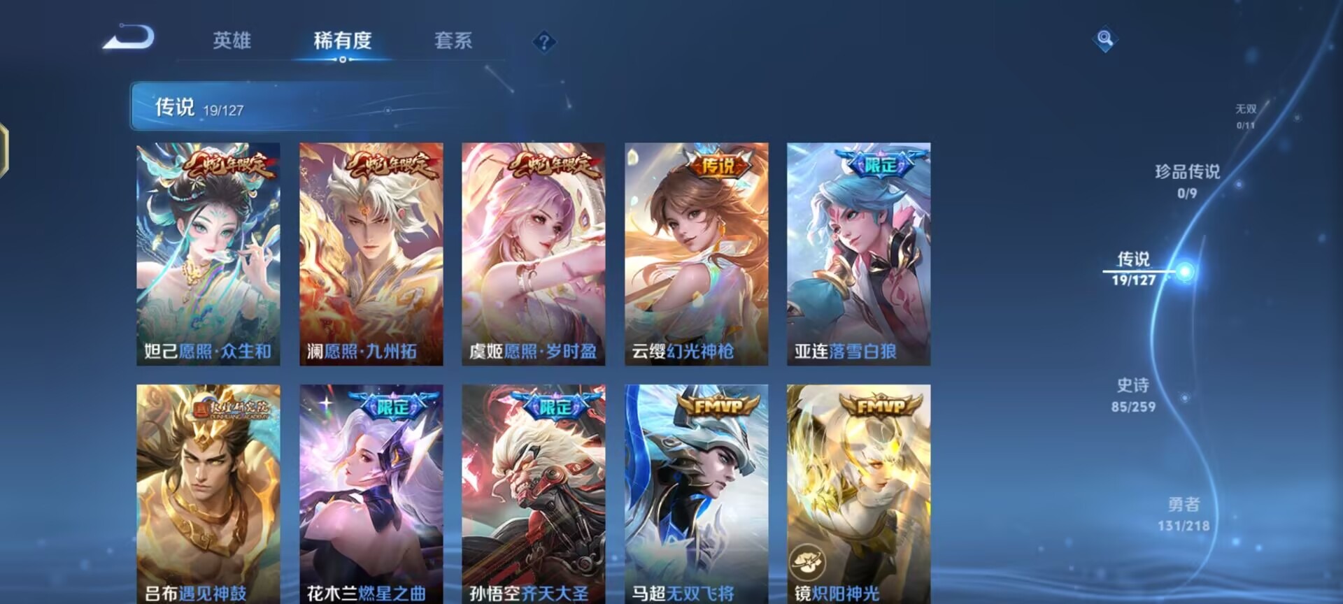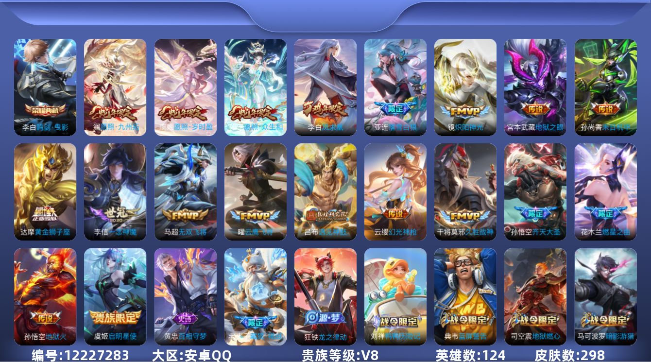 [12227283]V8 1典藏 19传说 124英雄 298皮肤 可修改实名 优质装备:鸣剑·曳影,黄金狮子座,云鹰飞将(小将军),久胜战神,炽阳神光,一念神魔,末日机甲-孙尚香(绿蚂蚱),地狱火,地狱之眼,无双飞将,燃星之曲,遇见神鼓 传说皮:落雪白狼,幻光神枪 珍宝阁皮:女武神,玩趣恶龙 限定皮:愿照·九州拓(澜年限),愿照·岁时盈(虞姬年限),愿照·众生和(妲己年限),凤求凰(白切鸡),傲雪梅枪,时之彼端,白晶晶,遇见飞天,高山流水,齐天大圣,五谷丰年,梁祝,天狼绘梦者,李小龙,辉光之辰,霸王别姬-虞姬,圣诞老人,真爱至上,纯白花嫁,大圣娶亲,寅虎·御盾(廉颇年限) 史诗皮:鸭鸭历险记-刘禅,苍鳞隐世,器灵·浮梦炉,糖绘人间,化蝶舞,星界战将,龙之律动,藏狐·褐绒,百相守梦-黄忠,紫霞仙子,白龙吟,黄金分割率,特工魅影,千年之狐,永昼,江河有灵,偶像歌手,暗夜猫娘,晚萤,冰冠公主,猫狗日记-孙策,猫狗日记-大乔,乱世虎臣,修罗,女仆咖啡,摇滚巨星,水果甜心,天才门将,星夜王子,心灵骇客,功夫厨神,德古拉伯爵,暗隐猎兽者,幽灵船长,鬼剑武藏,心灵战警,天秀·启明,地狱岩魂,纤云弄巧,繁星吟游(呼啦呼啦),缤纷独角兽,乘风破浪,水晶猎龙者,曙光守护者,箭羽风息,金属风暴,原初追逐者,圣诞狂欢,圣诞恋歌,鹰眼统帅,王者之锤,暗夜贵公子,魅力维加斯,黎明之约,寅虎·御盾,无心,未来纪元-赵云