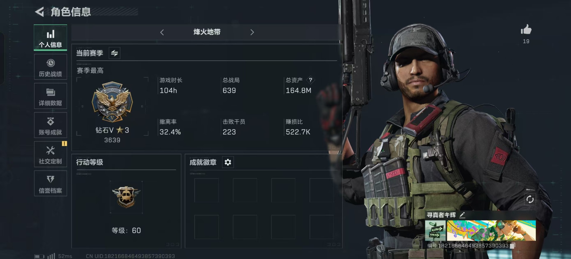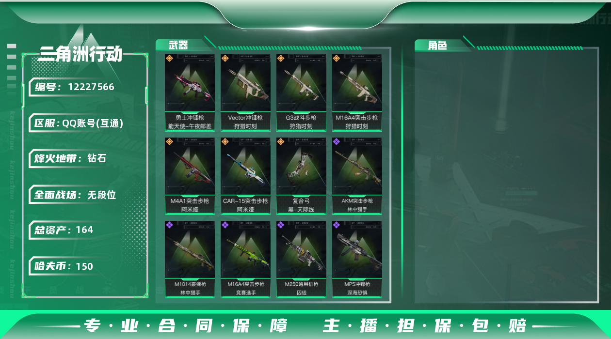 [12227566]总资产:164.8M 7传说枪械 哈夫币:150K 进阶安全箱(9.17到期) 可二次 可修改实名 烽火地带段位:钻石 全面战场段位:无段位 传说武器皮肤:M16A4突击步枪-狩猎时刻,M4A1突击步枪-阿米娅,CAR-15突击步枪-阿米娅,复合弓-黑-天际线,Vector冲锋枪-狩猎时刻,G3战斗步枪-狩猎时刻,勇士冲锋枪-能天使-午夜邮差 史诗武器皮肤:MP5冲锋枪-深海恐惧,AKM突击步枪-林中猎手,M16A4突击步枪-竞赛选手,M1014霰弹枪-林中猎手,SV-98狙击步枪-林中猎手,PTR-32突击步枪-英雄,M250通用机枪-囚徒,SCAR-H战斗步枪-囚徒