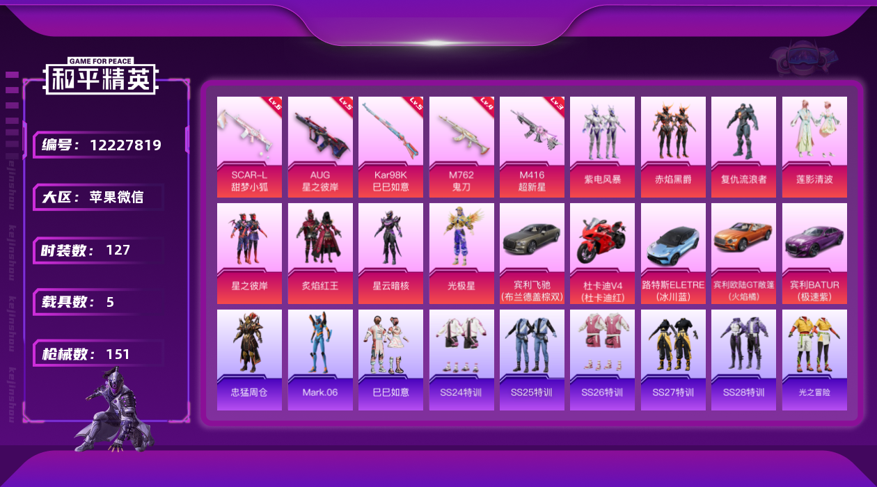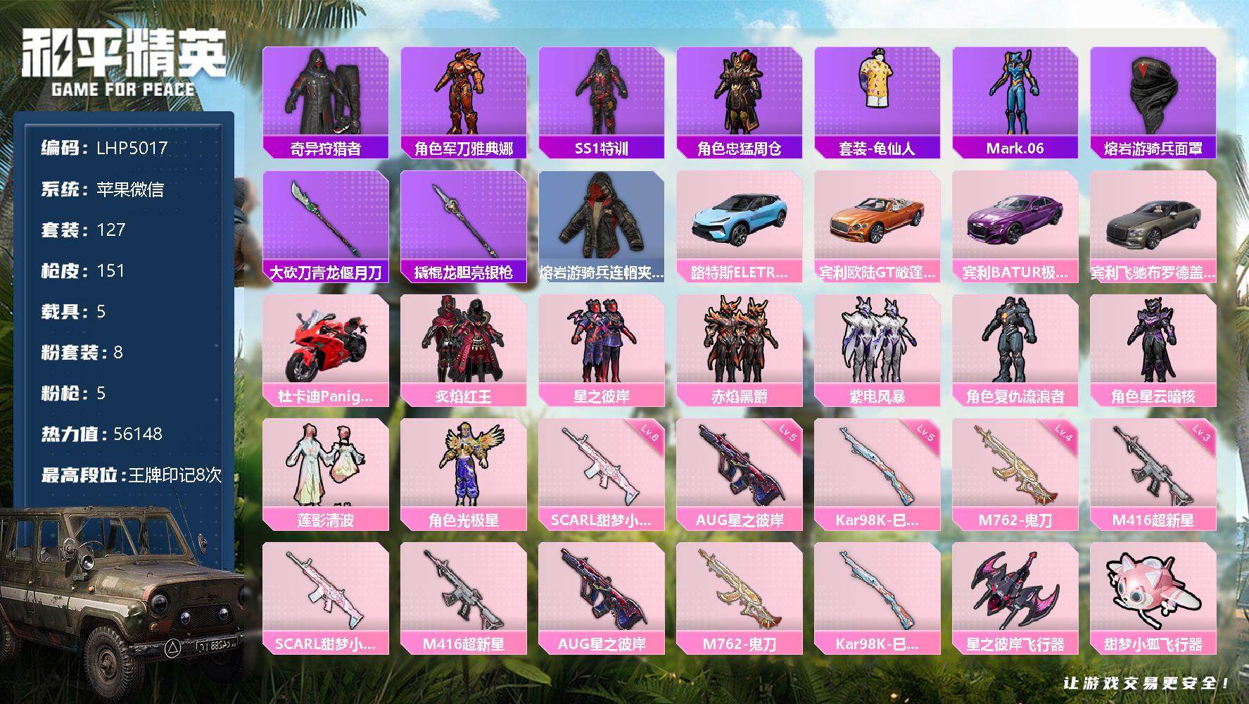 [12227819]【特价急出/详情看图】:苹果 微信-8粉装-5特效枪-5载具-56148热力值-8印记-127套装-151枪皮【热门品类】:套装-奇异狩猎者,角色-军刀雅典娜,套装-SS1特训,角色-忠猛周仓,套装-龟仙人,角色-Mark.06,熔岩游骑兵面罩,大砍刀-青龙偃月刀,撬棍-龙胆亮银枪,熔岩游骑连帽夹克【粉色载具】:路特斯ELETRE(冰川蓝),宾利欧陆GT敞篷(火焰橘),宾利BATUR(极速紫),宾利飞驰(布罗德盖棕双色),杜卡迪 Panigale V4(杜卡迪红)【粉色套装】:粉装-炙焰红王,粉装-星之彼岸,粉装-赤焰黑爵,粉装-紫电风暴,角色-复仇流浪者,角色-星云暗核,粉装-莲影清波,角色-光极星【粉色枪皮等级】:SCAR-L-甜梦小狐(六级),M416-超新星(三级),AUG-星之彼岸(五级),M762-鬼刀(四级),Kar98K-巳巳如意(五级)【粉色枪皮】:SCAR-L-甜梦小狐,M416-超新星,AUG-星之彼岸,M762-鬼刀,Kar98K-巳巳如意【粉色飞行器】:星之彼岸飞行器,甜梦小狐飞行器,镜域双华-灵镜之阶