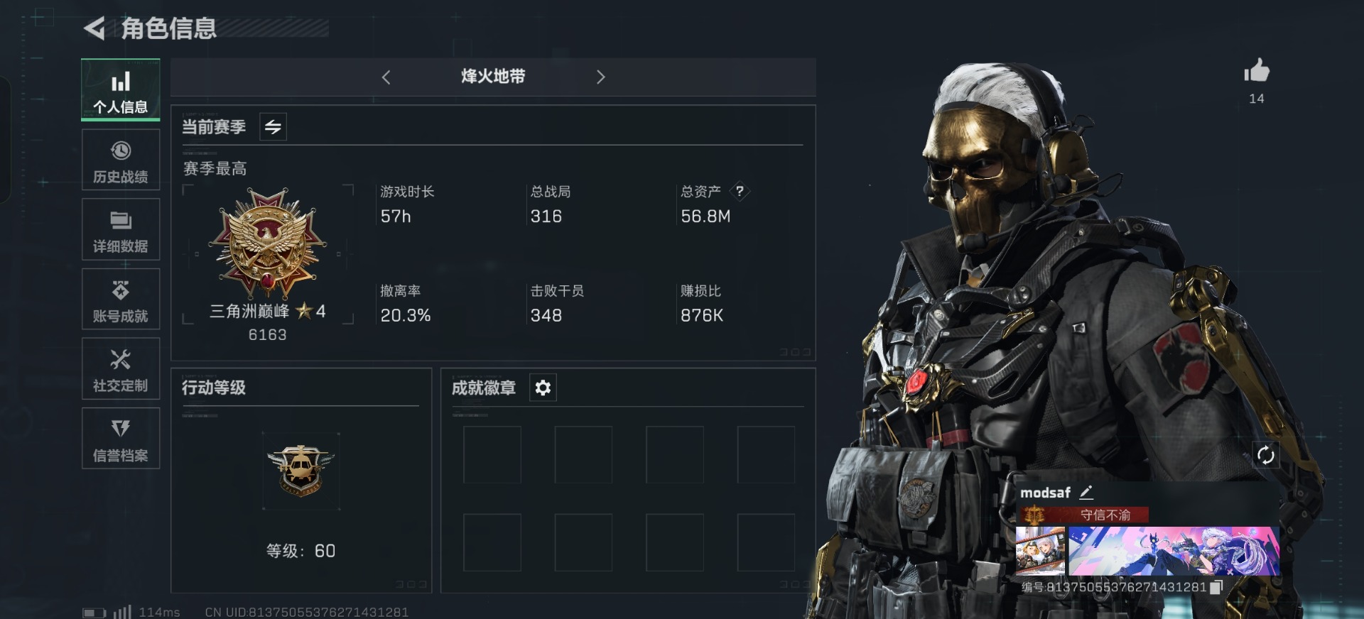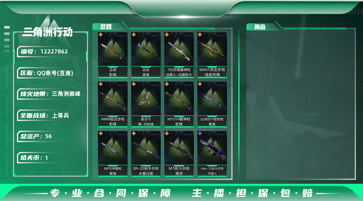 [12227862]总资产:56.8 2近战传说 11传说枪械 高级安全箱(2×3)9.15号到期 可二次 可修改实名 烽火地带段位:三角洲巅峰 全面战场段位:上等兵 哈夫币:1.132 传说武器皮肤:近战-影锋,近战-黑海,SR-25射手步枪-水墨云图,AWM狙击步枪-影锋,M1014霰弹枪-影锋,QJB201轻机枪-黑海,MP5冲锋枪-黑海,复合弓-黑-天际线,725双管霰弹枪-送葬人-无题密令,M7战斗步枪-维京,M4A1突击步枪-蚀金玫瑰 史诗武器皮肤:MP7冲锋枪-原型机(典藏),M700狙击步枪-蝮蛇,M700狙击步枪-守夜人,SG552突击步枪-尖端治疗,Ash-12战斗步枪-守夜人,腾龙突击步枪-无垢