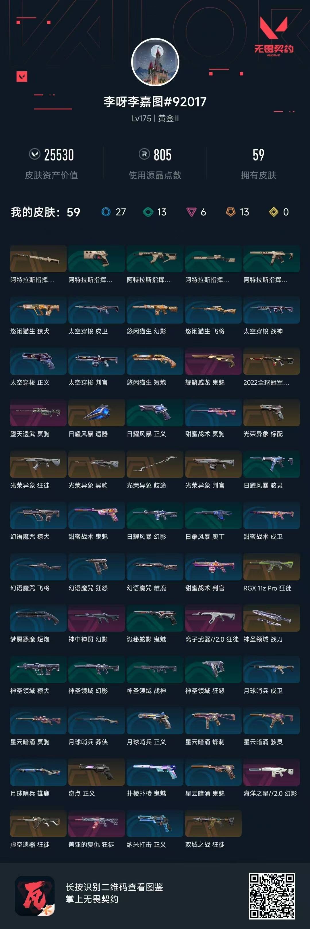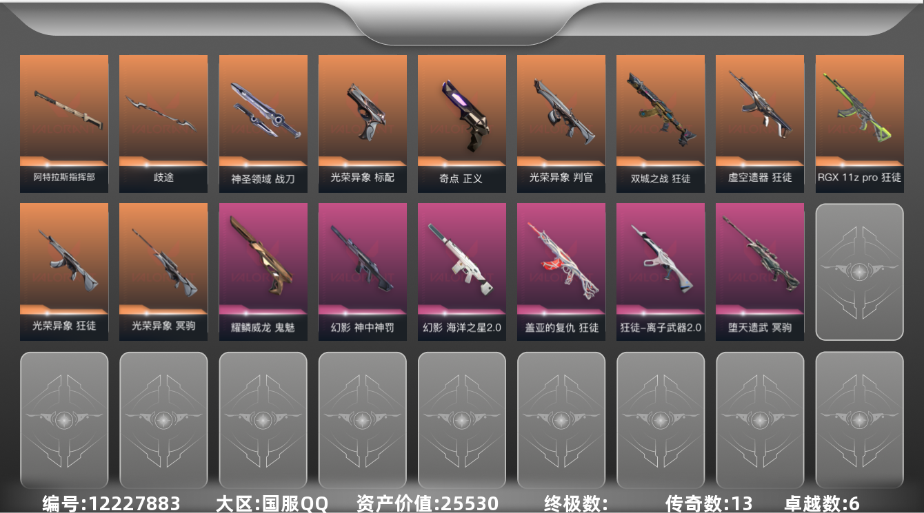 [12227883]13橙皮 6紫皮 59皮肤 27英雄 83卡面 805已用源晶 黄金 优质装备:正义-奇点,狂徒-盖亚的复仇,冥驹-堕天遗武,神圣领域 战刀,光荣异象,阿特拉斯指挥部,鬼魅-耀鳞威龙 套装:光荣异象 佩枪皮肤:标配-光荣异象 霰弹枪皮肤:判官-光荣异象 步枪皮肤:幻影-海洋之星2.0,狂徒-虚空遗器,狂徒-双城之战,幻影-神中神罚,狂徒-光荣异象,RGX 11z pro 狂徒,狂徒-离子武器2.0 狙击枪皮肤:冥驹-光荣异象