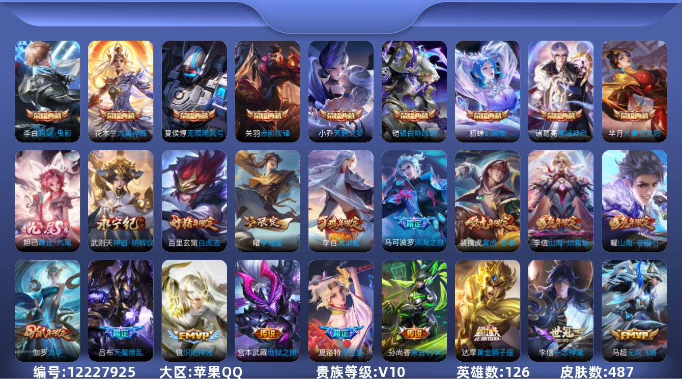 [12227925]V10 9典藏 2无双 68传说 126英雄 487皮肤 典藏英雄武则天 可修改实名 优质装备:天鹅之梦(小乔典藏),无限飓风号(高达),大秦宣太后,鸣剑·曳影,星域神启(倪克斯贼亮),九霄神辉(木兰典藏),赤影疾锋,银白咏叹调(倪克斯侍卫),幻阙歌(貂蝉典藏),神器·明辉仪,青丘·九尾(妲己无双),黄金狮子座,黄金射手座,冠军飞将,云鹰飞将(小将军),绛天战甲(鸡嘴战神),猫影幻舞,久胜战神,炽阳神光,一念神魔,云霓雀翎,末日机甲-孙尚香(绿蚂蚱),仲夏夜之梦(大飞蛾),音你心动-小乔,海洋之心,地狱之眼,飞鸢探春,音你心动-周瑜,胖达荣荣,李逍遥,时之恋人-刘备(电焊工),游龙清影(小青龙),淬星耀世,超时空战士-狄仁杰,遇见胡旋,末日机甲-孙策,挚爱之约,挚爱花嫁,无双飞将,音你闪耀(rap皮),碎云,天秀幻梦,神器·狴犴令,神器·明辉仪,山海·炽霜斩(李信年限),山海·琳琅生(小乔年限),山海·苍雷引(电光曜子),炽翼辉光(娃娃菜牛角包),燃星之曲,画中仙,浮生妄,记忆之芯(机甲兔),青丘·九尾,百相守梦(张飞),电玩·雷克斯,鹤羽星尊,惊梅引,鲁班七号-时之奇旅,艾琳觅芳踪 珍宝阁皮:优雅恋人,蔷薇恋人,女武神 限定皮:至尊宝,白虎志(电光耗子),凤求凰(白切鸡),凤凰于飞,太华(伽罗年限),梅西,武陵仙君(小桃花),异界灵契(白毛香),傲雪梅枪,补天,前尘镜,星穹之声,绯月行,时雨天司(水龙头),神威(电光马子),飞衡(韩信年限),山海·碧波行(瑶年限),无限倾心-项羽,遇见飞天,高山流水,诗剑行,无限倾心-虞姬,齐天大圣,匿光决锋者,怒海麟威,降魔,五谷丰年,青龙志(铠年限),冰锋战神,天狼运算者,游园惊梦,梁祝,天狼狩猎者,烈魂,岱宗(典韦年限),虎魄,逐梦之音,天狼绘梦者,李小龙,逐梦之影,玄武志(苏烈年限),朱雀志(守约年限),如梦令-嫦娥,如梦令-后羿,霸王别姬-项羽,圣诞老人,默契交锋-兰陵王,真爱至上,孙行者,猪悟能,引擎之心,天魔缭乱,蜜橘之夏,热情桑巴,神奇女侠,寅虎·赤拳(老虎年限),时之祈愿-云中君,玉兔公主,启示之音,无尽星芒,深海之息(深海大菠萝),唐三藏,枫霜尽,匿光启智者,时之奇旅-妲己,神器·万象笔,梦圆繁星,山海·玄木吟(马可年限),冰霜神祇 史诗皮:灵蛊蚀心,遇见神鹿,紫霞仙子,苍穹之光,电玩小子(小书包),白龙