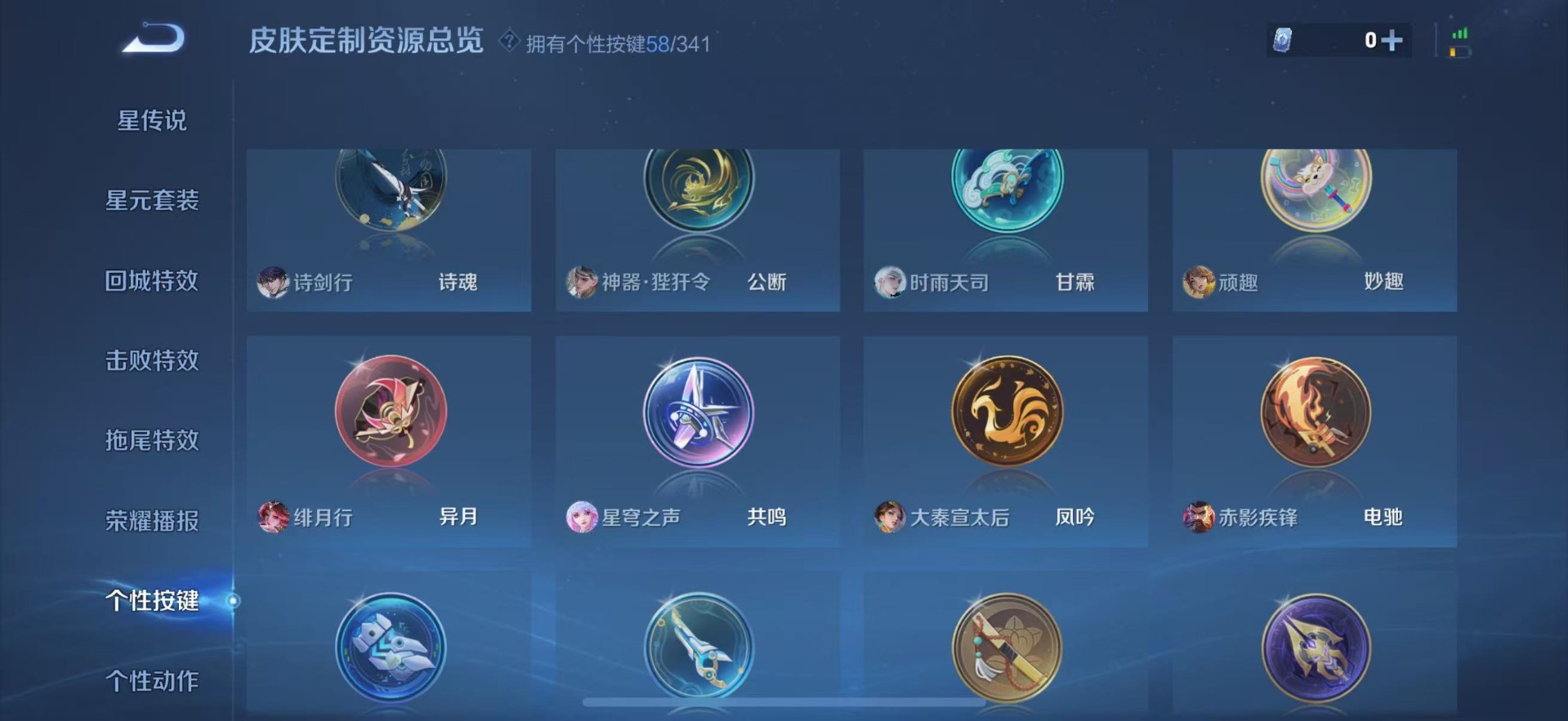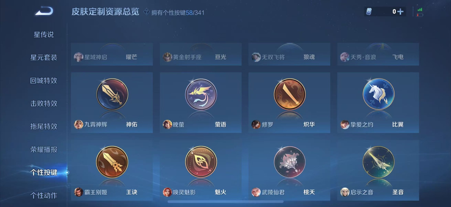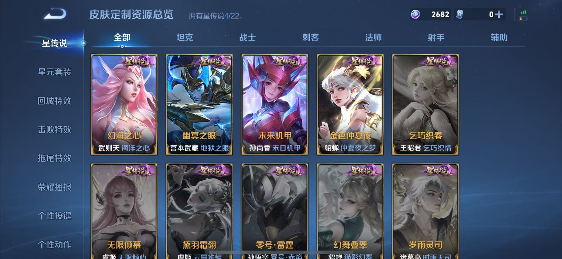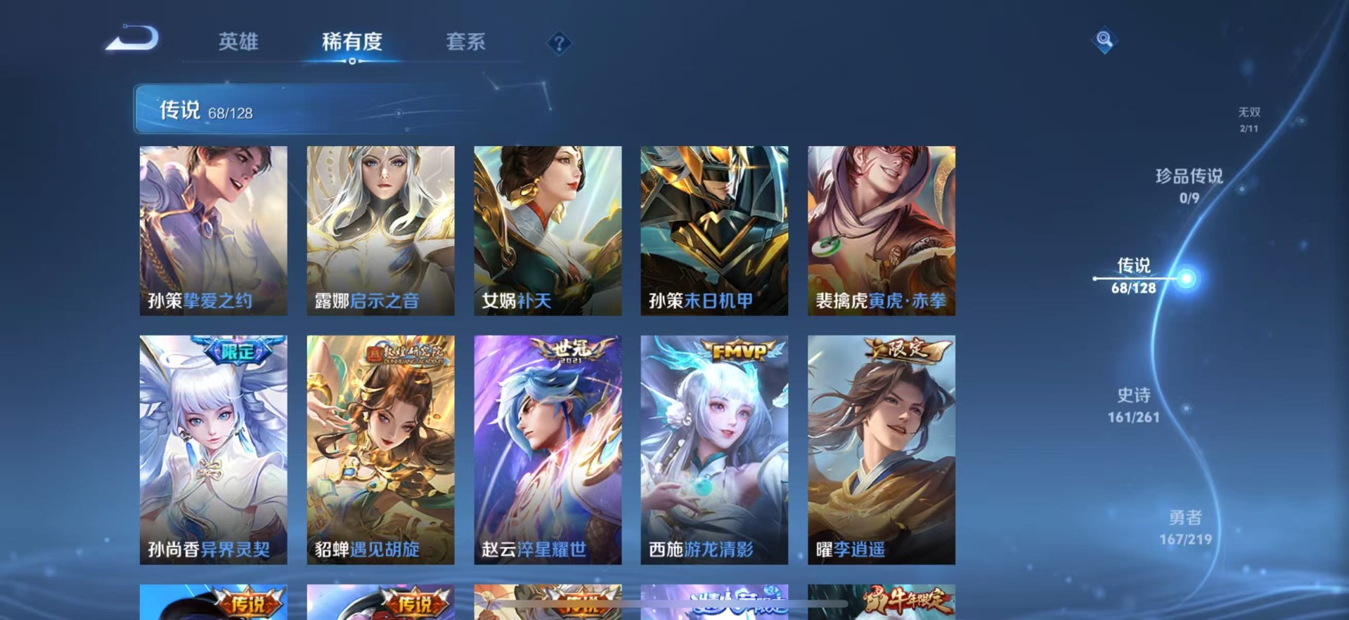 金蝉唐三藏,夏侯惇匿光决锋者,黄忠烈魂,老夫子圣诞老人,盾山梦圆繁星,铠青龙志,伽罗太华,苏烈玄武志,张飞虎魄,孙膑天狼运算者,典韦岱宗,孙尚香异界灵契,不知火舞绯月行,项羽霸王别姬,后羿无尽星芒,后羿如梦令,露娜启示之音,周瑜真爱至上,诸葛亮时雨天司,兰陵王默契交锋,公孙离玉兔公主,公孙离蜜橘之夏,裴擒虎梅西,貂蝉逐梦之音,鲁班大师匿光启智者,裴擒虎李小龙,裴擒虎天狼狩猎者,裴擒虎寅虎·赤拳,上官婉儿梁祝,上官婉儿神器·万象笔,上官婉儿天狼绘梦者,李白诗剑行,马可波罗山海·玄木吟,马可波罗深海之息,猪八戒猪悟能,女娲补天,孙悟空孙行者,孙悟空至尊宝,百里玄策白虎志,马超神威,雅典娜神奇女侠,赵云引擎之心,盘古冰霜神祇,云中君时之祈愿,妲己时之奇旅,韩信傲雪梅枪,韩信飞衡,韩信逐梦之影,百里守约朱雀志,墨子降魔,瑶山海·碧波行,娜可露露前尘镜,妲己热情桑巴,王昭君凤凰于飞,嫦娥如梦令,王昭君星穹之声,关羽冰锋战神,橘右京枫霜尽