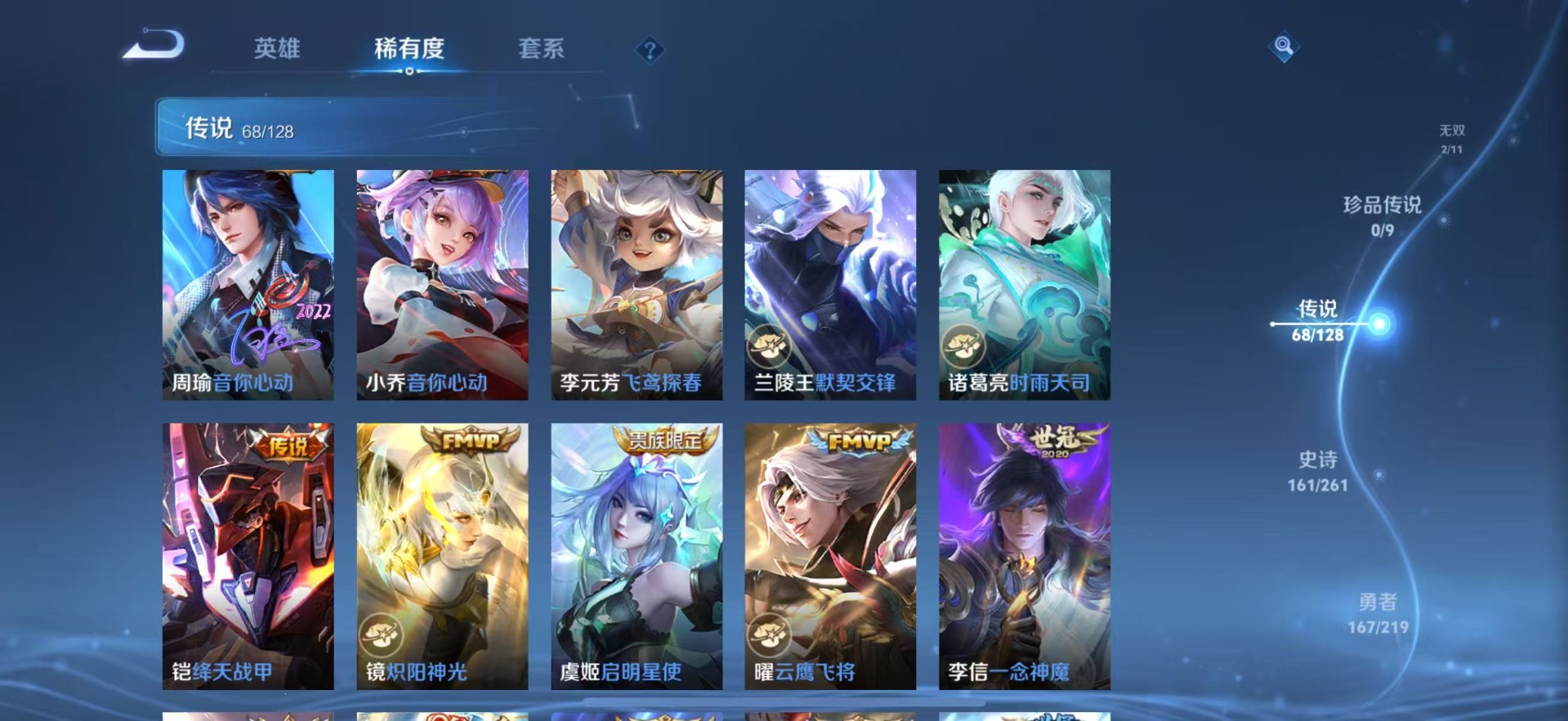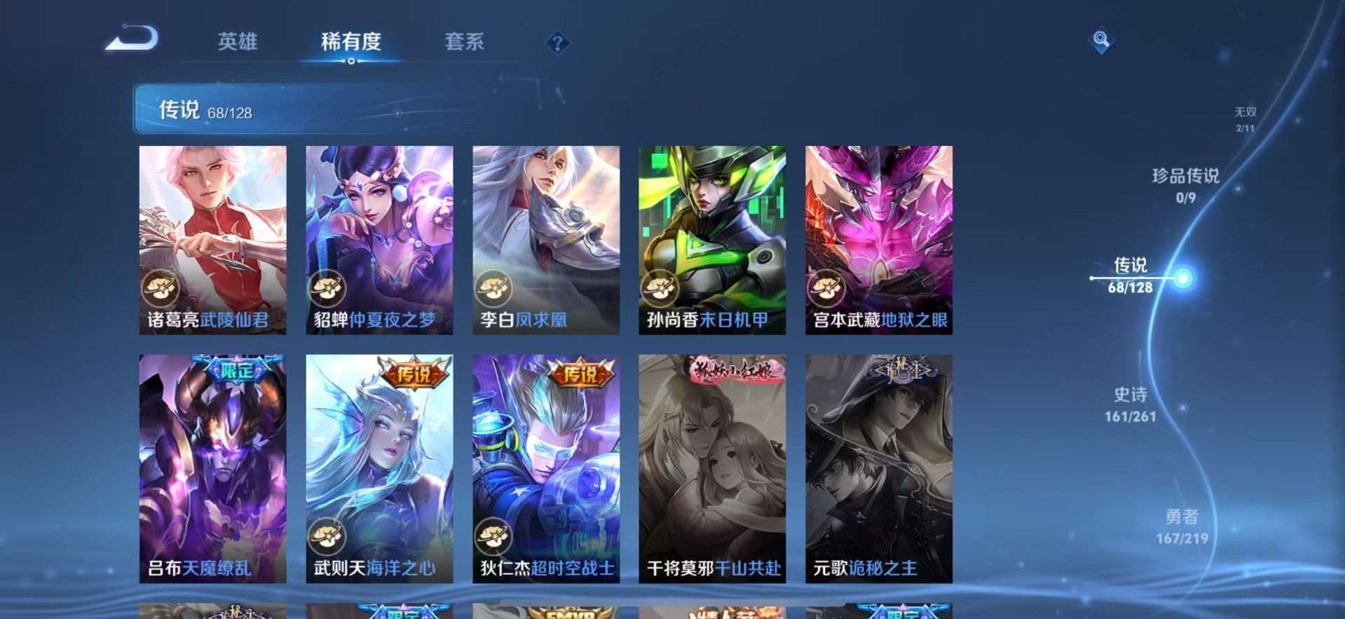 - PX_2098144-Q/永恒钻石/283皮肤/125英雄/0典藏/0珍品无双/0无双/0珍品传说/13传说/80史诗/9稀有英雄 【13 传说皮肤】武圣 关羽,启明星使 虞姬,无双飞将 马超,白虎志 百里玄策,零号·赤焰 孙悟空,云鹰飞将 曜,游龙清影 西施,遇见胡旋 貂蝉,武陵仙君 诸葛亮,海洋之心 武则天,炽阳神光 镜,寅虎·瑞焰 鲁班七号,时之恋人 刘备, 【80 史诗皮肤】时之奇旅 安琪