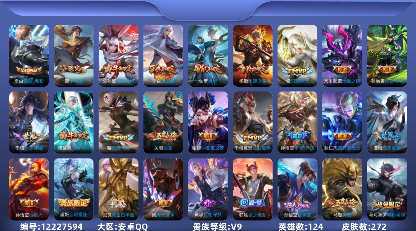 [12227594]V9 1典藏 21传说 124英雄 272皮肤 可修改实名 女号 优质装备:鸣剑·曳影,云鹰飞将(小将军),绛天战甲(鸡嘴战神),黄金白羊座,久胜战神,炽阳神光,一念神魔,云霓雀翎,末日机甲-孙尚香(绿蚂蚱),地狱火,仲夏夜之梦(大飞蛾),零号·赤焰,地狱之眼,李逍遥,超时空战士-狄仁杰 珍宝阁皮:女武神 限定皮:至尊宝,凤求凰(白切鸡),凤凰于飞,太华(伽罗年限),傲雪梅枪,时之彼端,白晶晶,时雨天司(水龙头),神威(电光马子),飞衡(韩信年限),遇见飞天,高山流水,武圣,游园惊梦,梁祝,御风骁将(吕布年限),逐梦之星,天狼溯光者,天狼征服者,祈雪灵祝(雪兔子),李小龙,逐梦之影,永曜之星,辉光之辰,霸王别姬-项羽,霸王别姬-虞姬,默契交锋-花木兰,猪悟能,青春决赛季,乒乒小将,神奇女侠 史诗皮:化蝶舞,龙之律动,百相守梦-黄忠,电玩小子(小书包),白龙吟,黄金分割率,特工魅影,千年之狐,魅语,无限星赏官,偶像歌手,晚萤,暗夜猫娘,末日机甲-吕布,猫狗日记-孙策,猫狗日记-大乔,乱世虎臣,节奏热浪,修罗,女仆咖啡,摇滚巨星,水果甜心,天才门将,星夜王子,功夫厨神,暗隐猎兽者,幽灵船长,心灵战警,纤云弄巧,繁星吟游(呼啦呼啦),乘风破浪,逐浪之夏,龙鼓争鸣,水晶猎龙者,箭羽风息,金属风暴,原初追逐者,圣诞狂欢,圣诞恋歌,鹰眼统帅,暗夜贵公子,魅力维加斯,未来纪元-赵云