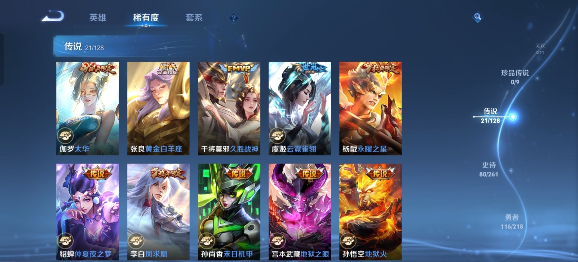 曹操天狼征服者,伽罗天狼溯光者,伽罗太华,鲁班七号乒乒小将,项羽霸王别姬,吕布御风骁将,后羿辉光之辰,诸葛亮时雨天司,公孙离祈雪灵祝,裴擒虎李小龙,上官婉儿梁祝,花木兰默契交锋,花木兰青春决赛季,马可波罗逐梦之星,猪八戒猪悟能,芈月白晶晶,孙悟空至尊宝,马超神威,雅典娜神奇女侠,妲己时之彼端,韩信傲雪梅枪,韩信飞衡,韩信逐梦之影,虞姬霸王别姬,王昭君凤凰于飞,关羽武圣