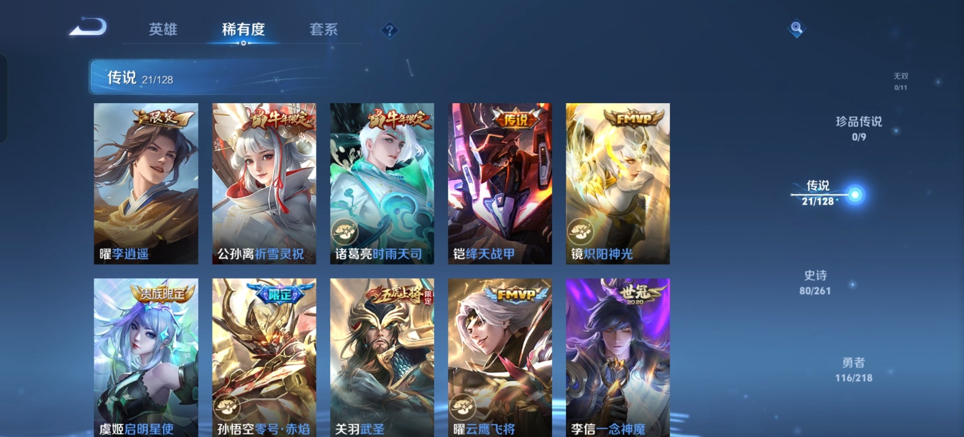 - PX_2078149-贵族等级: V5 英雄数: 42 皮肤数: 40 传说皮: 地狱火 限定皮: 梁祝,天狼狩猎者