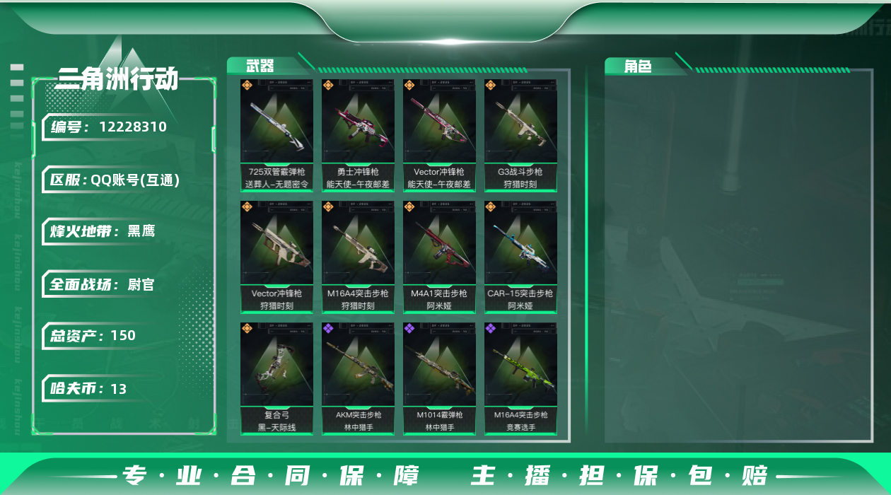 [12228310]总资产:150.6M 9传说枪械 哈夫币:13.375K 高级安全箱(2×3)9.15号到期 可二次 可修改实名 烽火地带段位:黑鹰 全面战场段位:尉官 传说武器皮肤:M16A4突击步枪-狩猎时刻,M4A1突击步枪-阿米娅,CAR-15突击步枪-阿米娅,复合弓-黑-天际线,Vector冲锋枪-狩猎时刻,G3战斗步枪-狩猎时刻,勇士冲锋枪-能天使-午夜邮差,725双管霰弹枪-送葬人-无题密令,Vector冲锋枪-能天使-午夜邮差 史诗武器皮肤:PKM通用机枪-蝮蛇,M16A4突击步枪-竞赛选手,PKM通用机枪-荒野求生,SG552突击步枪-深海恐惧,AKM突击步枪-林中猎手,SR-3M紧凑突击步枪-荒野求生,M1014霰弹枪-林中猎手,SV-98狙击步枪-林中猎手,PTR-32突击步枪-英雄,SVD狙击步枪-荒野求生,SV-98狙击步枪-囚徒,腾龙突击步枪-无垢,MP7冲锋枪-无垢,PSG-1射手步枪-无垢,QBZ95-1突击步枪-曙光,沙漠之鹰-曙光,Vector冲锋枪-阿萨拉文明