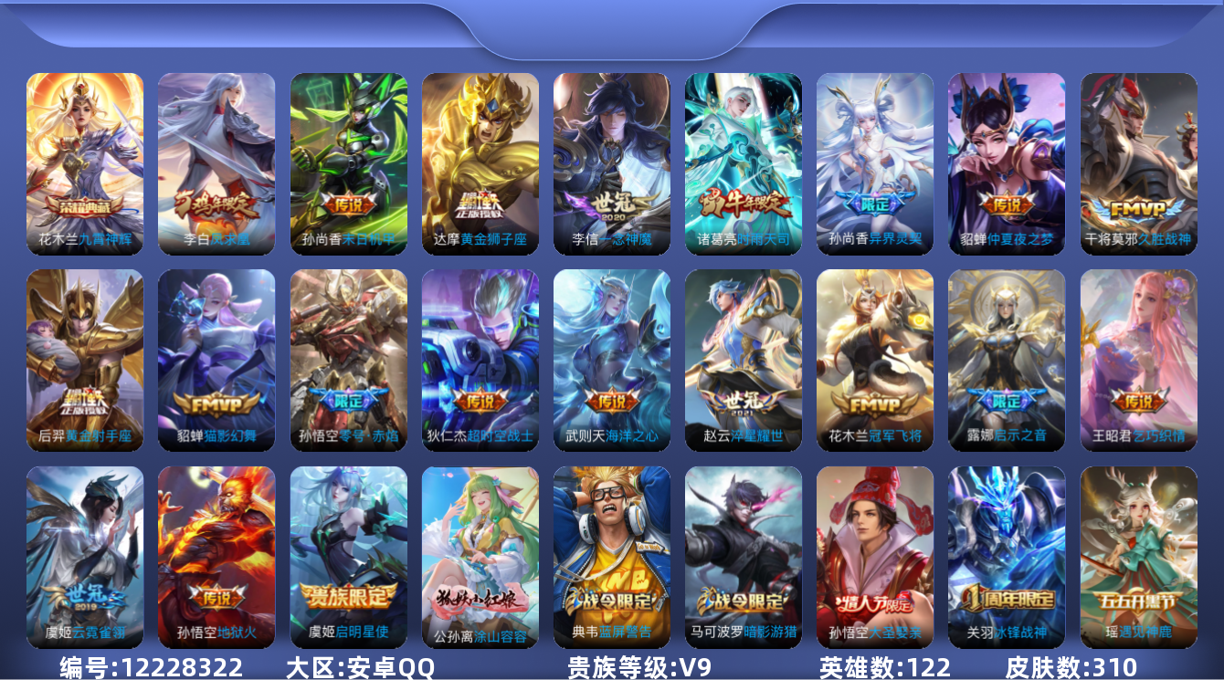 [12228322]V9 1典藏 20传说 122英雄 310皮肤 典藏英雄武则天 可修改实名 优质装备:九霄神辉(木兰典藏),黄金狮子座,黄金射手座,冠军飞将,猫影幻舞,久胜战神,一念神魔,云霓雀翎,末日机甲-孙尚香(绿蚂蚱),地狱火,仲夏夜之梦(大飞蛾),零号·赤焰,海洋之心,乞巧织情,淬星耀世,超时空战士-狄仁杰,涂山容容 珍宝阁皮:蔷薇恋人,女武神 限定皮:凤求凰(白切鸡),凤凰于飞,异界灵契(白毛香),白鹤梁神女,白晶晶,时雨天司(水龙头),遇见飞天,高山流水,五谷丰年,冰锋战神,天狼运算者,游园惊梦,梁祝,御风骁将(吕布年限),天狼狩猎者,天狼溯光者,天狼绘梦者,李小龙,逐梦之光,猪悟能,大圣娶亲,云端筑梦师,热情桑巴,神奇女侠,美猴王,女儿国国王,启示之音 史诗皮:遇见神鹿,紫霞仙子,苍穹之光,电玩小子(小书包),白龙吟,黄金分割率,特工魅影,千年之狐,永昼,魅语,无限星赏官,冰冠公主,青蛇,偶像歌手,暗夜猫娘,龙骑士(小龙虾),末日机甲-吕布,猫狗日记-孙策,猫狗日记-大乔,乱世虎臣,节奏热浪,修罗,女仆咖啡,摇滚巨星,水果甜心,绅士熊喵,天才门将,星夜王子,心灵骇客,时之奇旅-安琪拉,功夫厨神,德古拉伯爵,暗隐猎兽者,幽灵船长,鬼剑武藏,心灵战警,舞动绿茵,地狱岩魂,诗语江南,纤云弄巧,繁星吟游(呼啦呼啦),拒霜思,缤纷独角兽,乘风破浪,逐浪之夏,水晶猎龙者,曙光守护者,箭羽风息,金属风暴,圣诞狂欢,圣诞恋歌,鹰眼统帅,魅力维加斯,天秀·音浪,千筹问战,无心,未来纪元-赵云